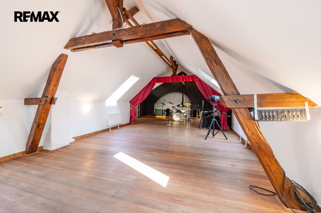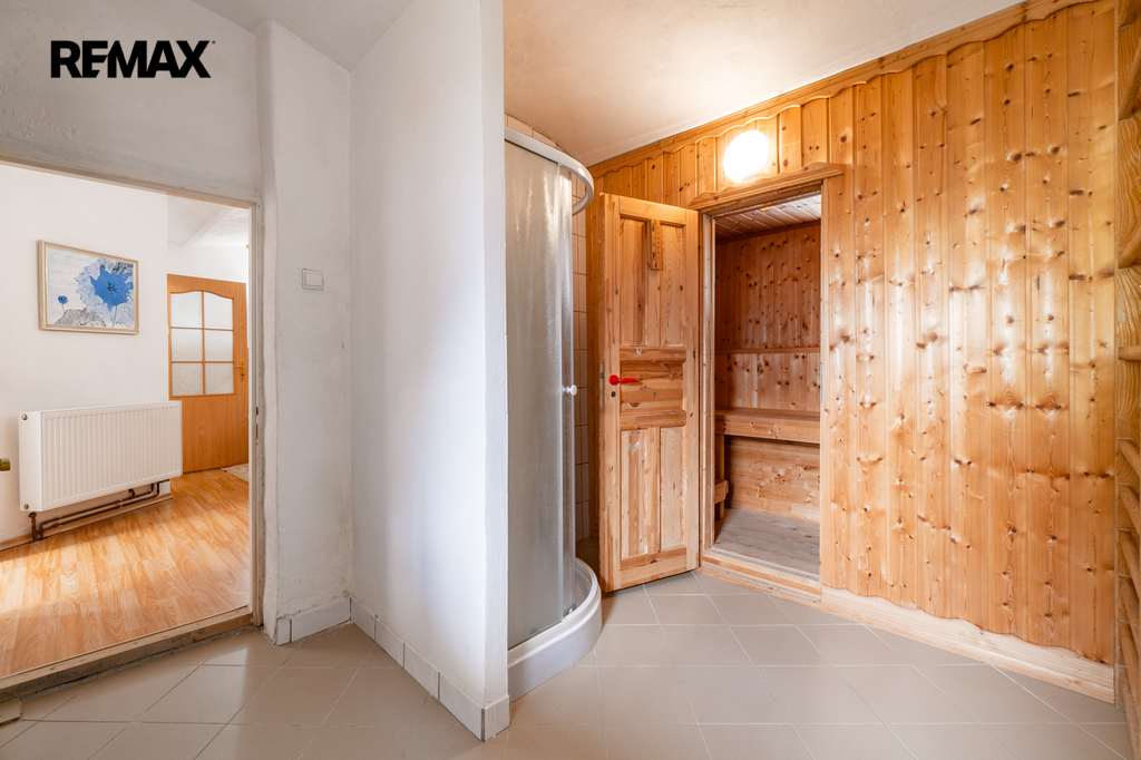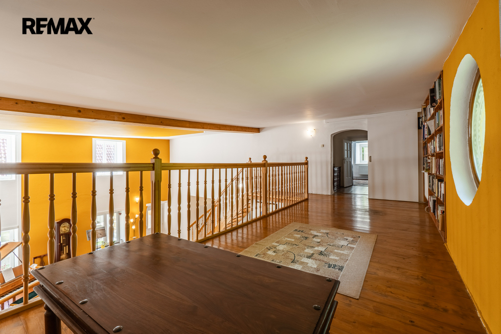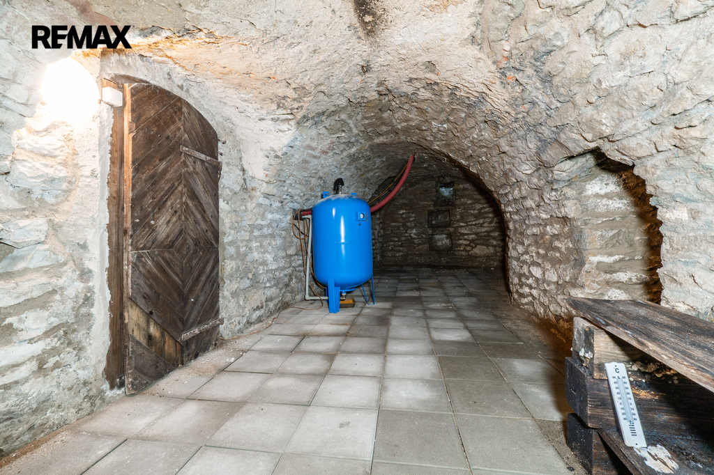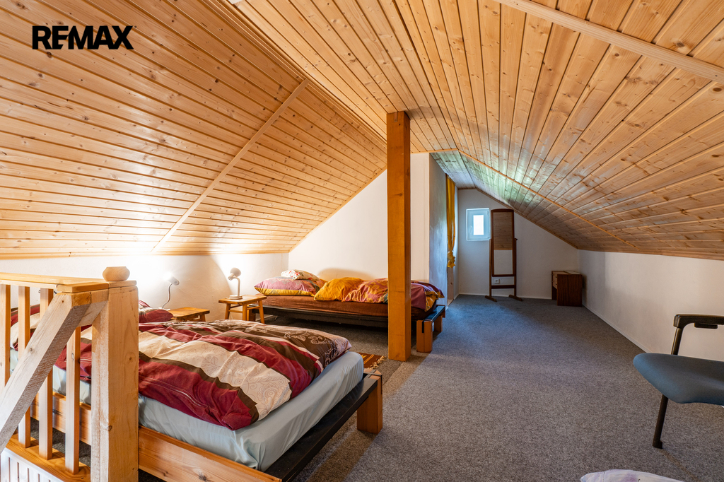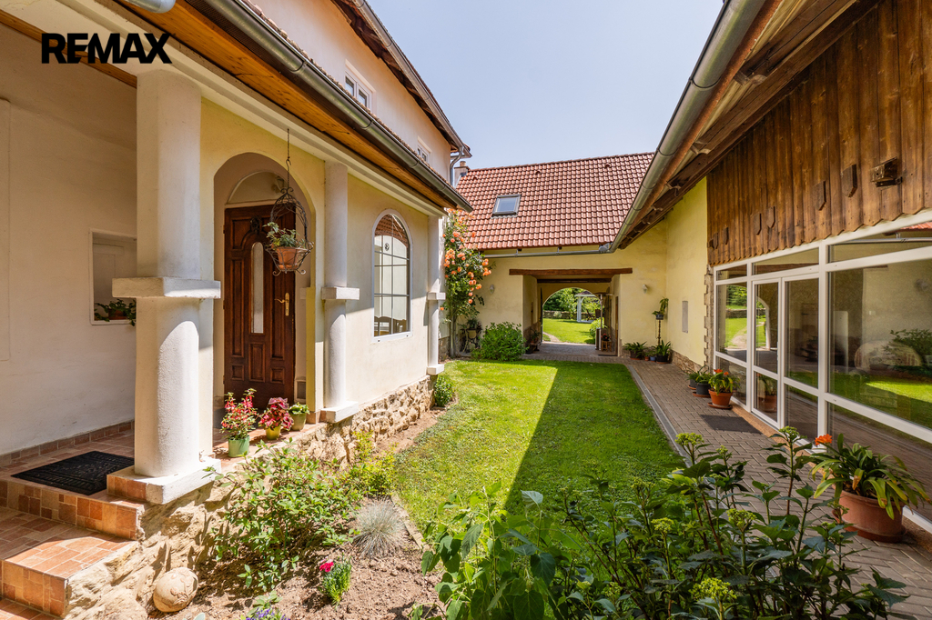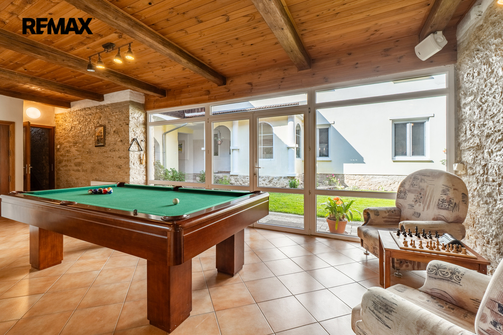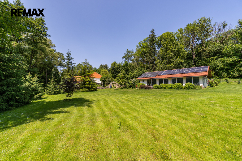 Celková užitná plocha činí 786 m² a nabízí mimo jiné i sál vhodný pro pořádání větších akcí. Nechybí dvě garáže s dostatkem místa pro techniku i vozidla. Ať už hledáte nové rodinné zázemí nebo výjimečné místo pro podnikání v souladu s přírodou, tato nemovitost vám dá prostor pro obojí. Dům má kamenné základy a využíván je také sklepní prostor přístupný z prostorné obývací haly, vedle kuchyňského koutu.
