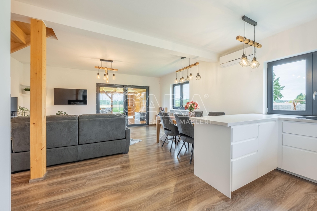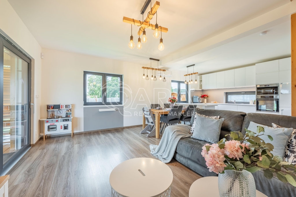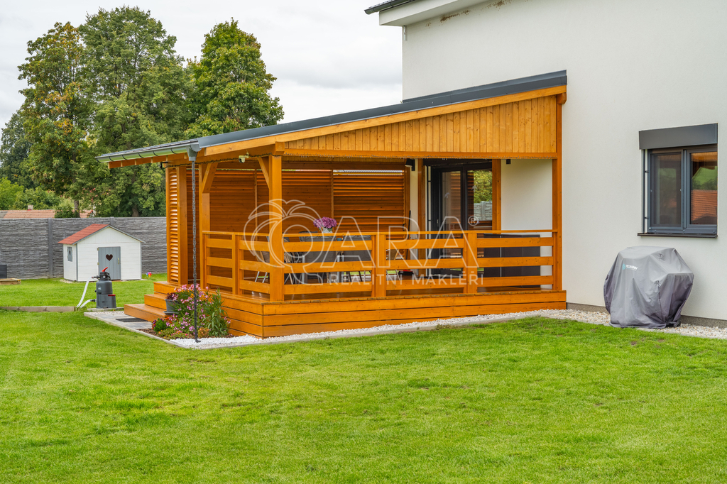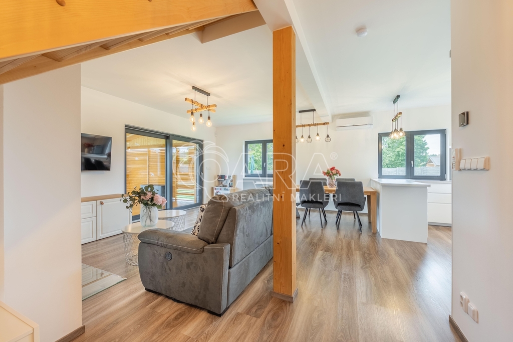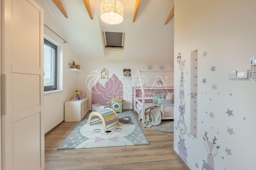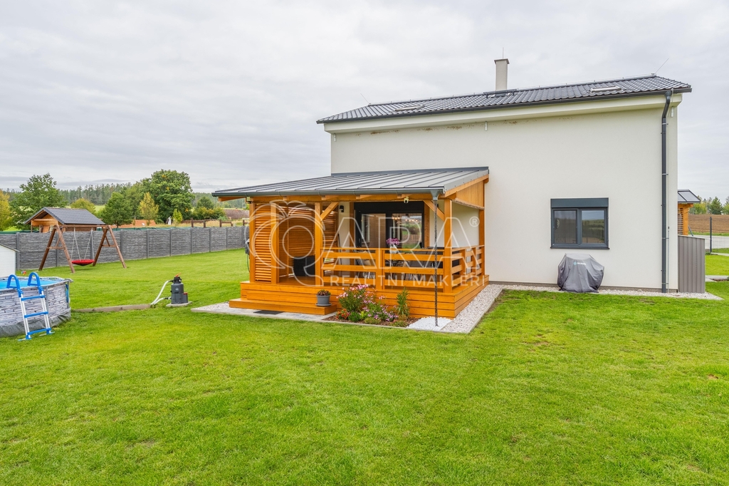 Dvoupodlažní rodinný dům o celkové ploše 136,9 m² se rozkládá na pozemku o výměře 1851 m². Dům je dispozičně řešen jako 6+kk s přímo navazující terasou. Dům sestává z obývacího pokoje s kuchyňským koutem, pěti pokojů, technické místnosti, spíže, chodby, koupelny se sprchovým koutem a WC v prvním patře a koupelny s vanou, sprchovým koutem a WC ve druhém patře. Z pozemku je krásný výhled na les.
