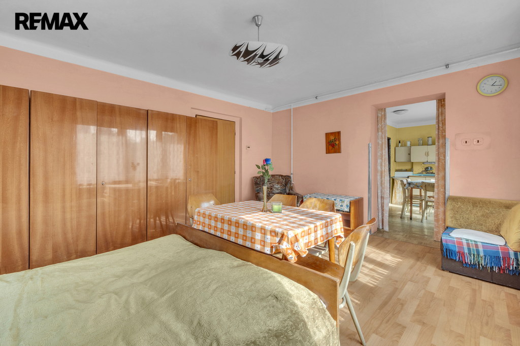 Dispozice: ložnice, obývací pokoj, koupelna, samostatné WC, chodba, pokoj, spíž, technická místnost a zádveří.