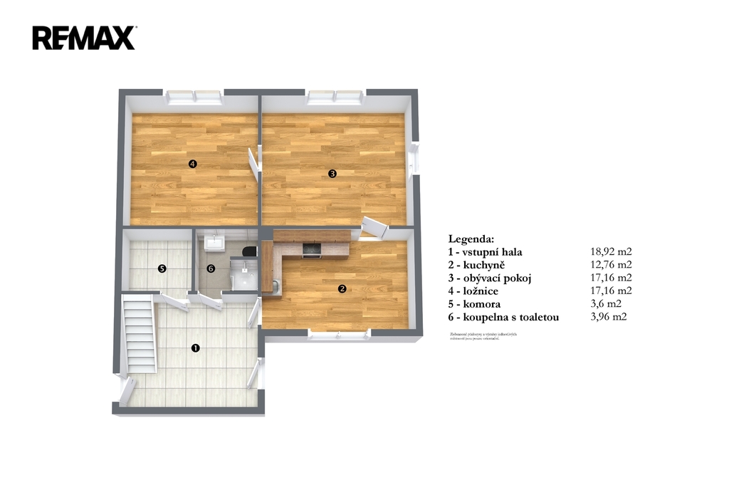 Přízemí: vstupní hala, kuchyň, obývací pokoj, ložnice, komora, koupelna s toaletou, vstup do kotelny