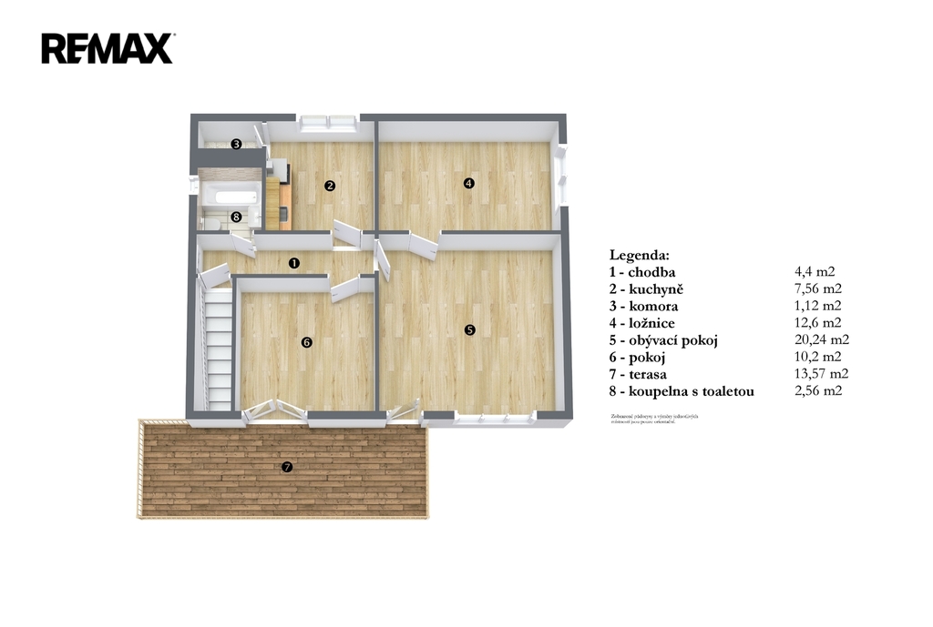 Patro: chodba, kuchyně, obývací pokoj, ložnice, pokoj se vstupem na terasu, koupelna s toaletou