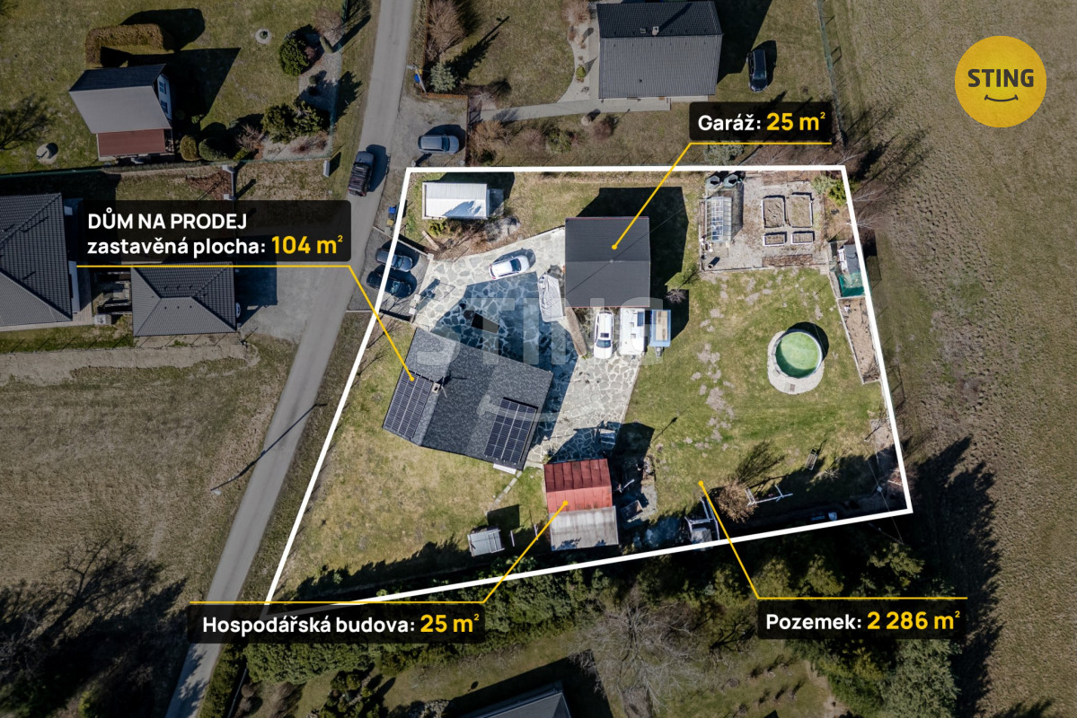 Dům o užitné ploše 162 m² stojí na rovinatém pozemku o rozloze 2.286 m², který zahrnuje krásně udržovanou zahradu s bazénem + písková filtrace, s houpačkami a dětským domečkem, se zděnou garáží (se zvedákem na auta s nosností 3 t), se zděnou hospodářskou budovou s veškerým zařízením pro provoz 20ti fotovoltaických panelů (FVE), umístěných na střeše rodinného domu. Tímto se stává tato nemovitost moderním a úsporným bydlení z hlediska energetické nezávislosti, ale i legislativních požadavků. Dům je zděný (zateplený 14 cm polystyrénem) s kamennými základy z pískovce, střešní krytina je šindelová (tepelná izolace 35 cm minerální vata), okna plastová dvojkomorová.