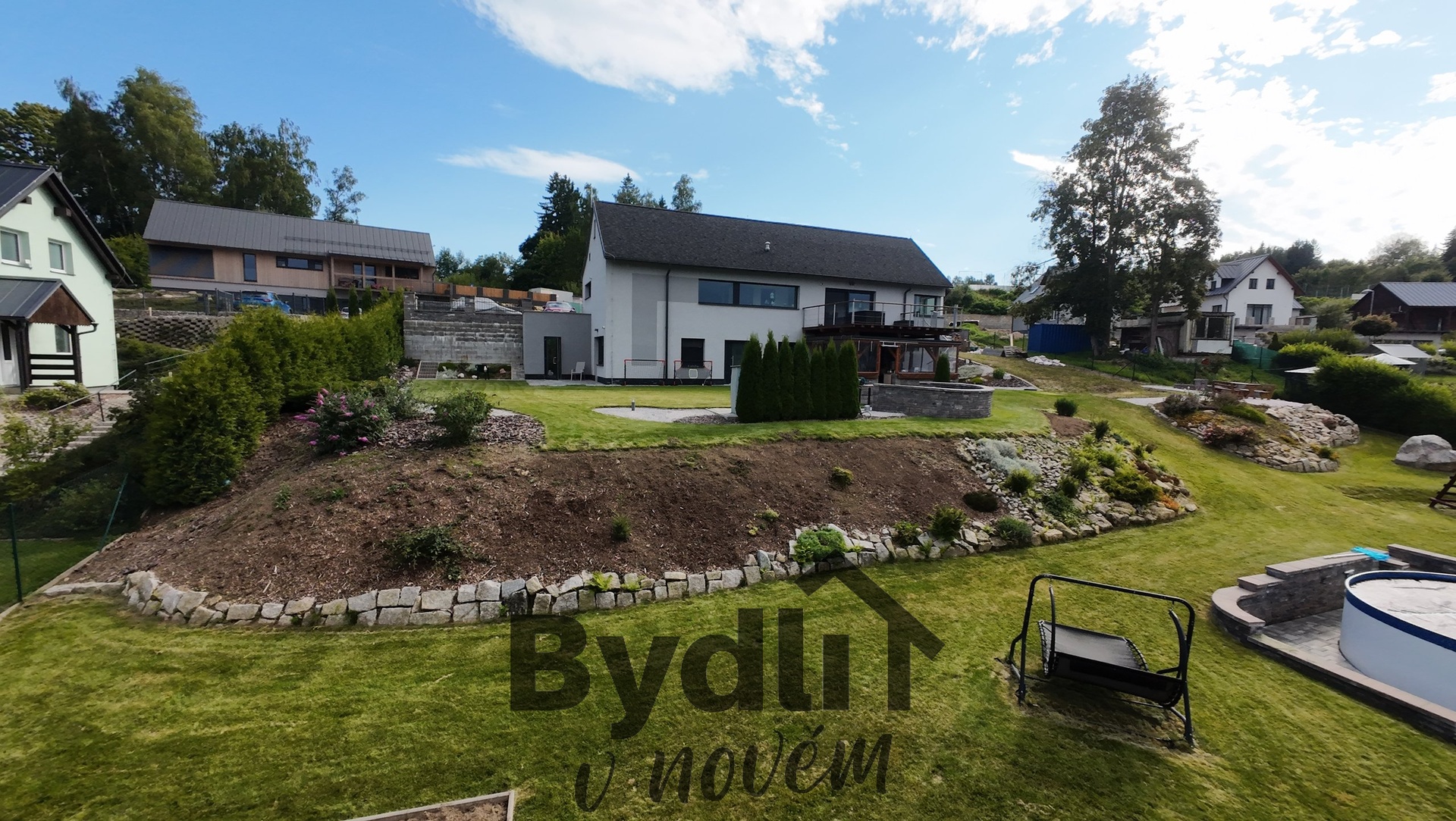 Exteriér: Slunná terasa s výhledem, který se nikdy neomrzí, a zahrada s rozvody pitné i užitkové vody pro maximální komfort.