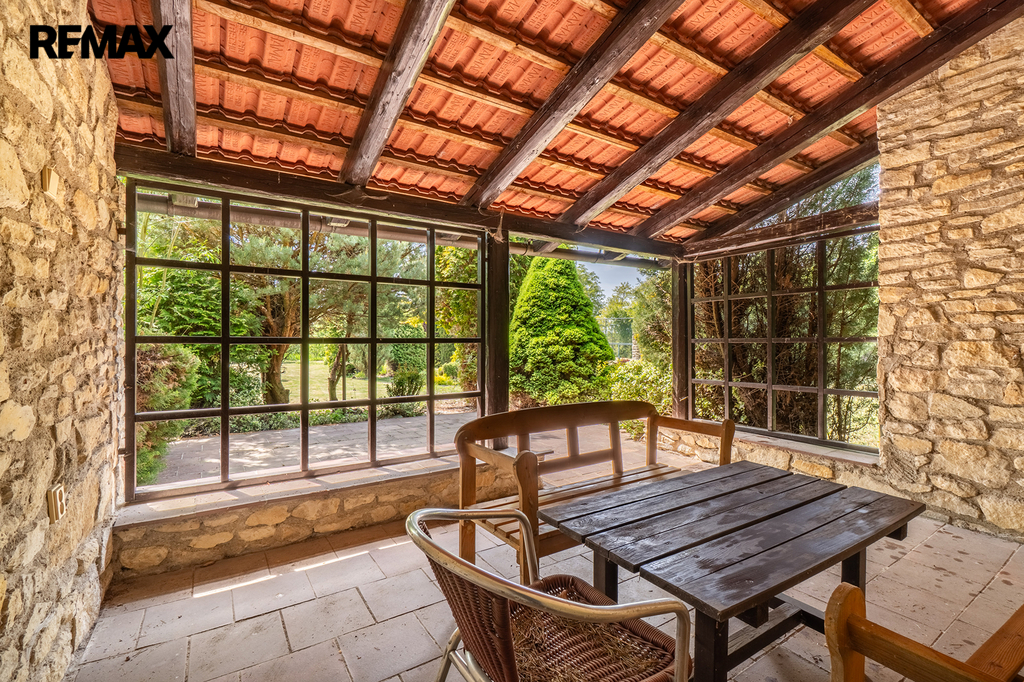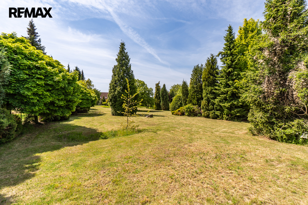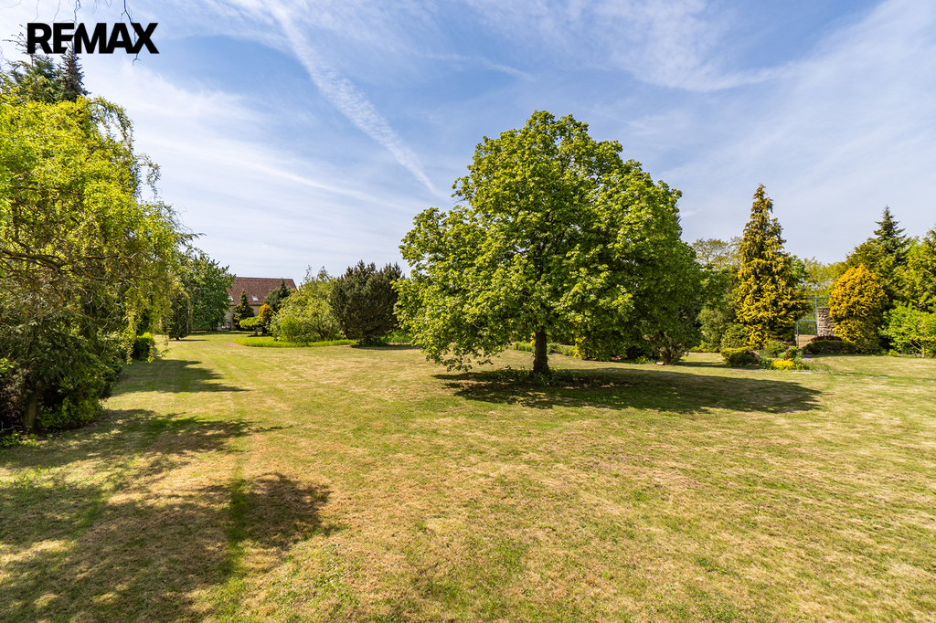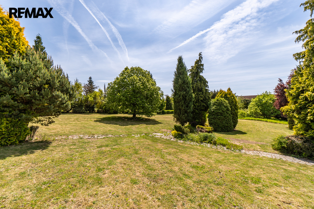 A za tím vším? Okouzlující zahrada zámeckého stylu o rozloze 6 160 m² se vzrostlými dřevinami, altánem, tenisovým kurtem, romantickým jezírkem a velkým podzemním rezervoárem na vodu. Ten zajišťuje soběstačnost v zásobování vodou pro instalovaný závlahový systém.