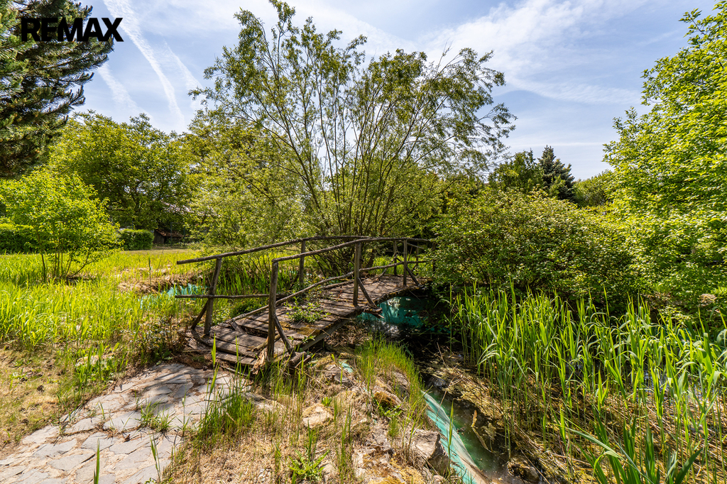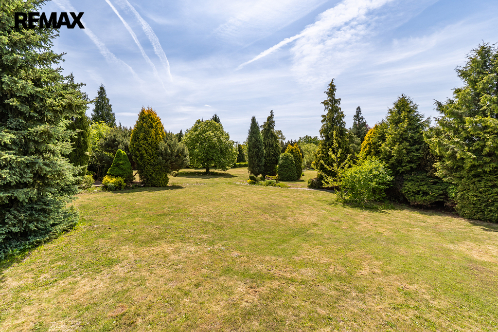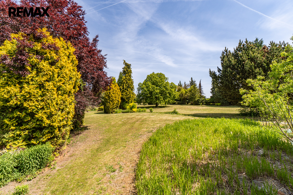 A za tím vším? Okouzlující zahrada zámeckého stylu o rozloze 6 160 m² se vzrostlými dřevinami, altánem, tenisovým kurtem, romantickým jezírkem a velkým podzemním rezervoárem na vodu. Ten zajišťuje soběstačnost v zásobování vodou pro instalovaný závlahový systém.