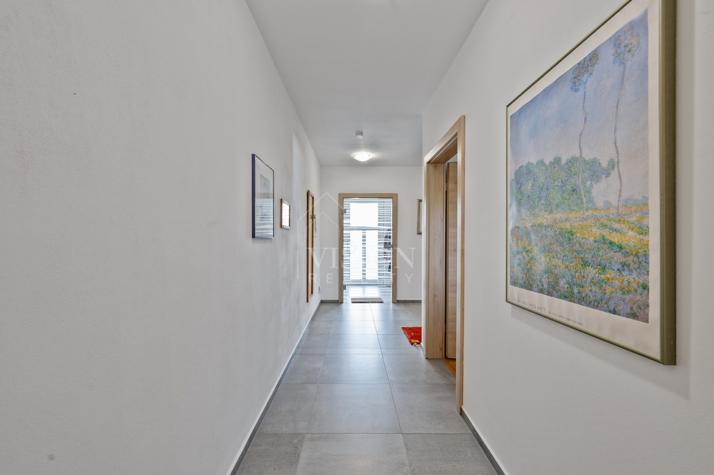 V přízemí se nachází prostorný obývací pokoj spojený s kuchyní, tvořící srdce celého domu, pracovna, ideální pro domácí kancelář, dále ložnice a koupelna. V druhém nadzemním podlaží rodinného domu se nachází dva prostorné dětské pokoje, koupelna, relaxační místnost určená k odpočinku, dále komfortní ložnice a rozsáhlá místnost s potenciálem pro vybudování dalších dvou pokojů podle potřeb nového majitele – ideální například pro rozšíření obytné části, hernu nebo pracovnu. Toto podlaží tak nabízí velkorysý prostor pro pohodlné rodinné bydlení s možností dalšího rozvoje a přizpůsobení dle individuálních představ.