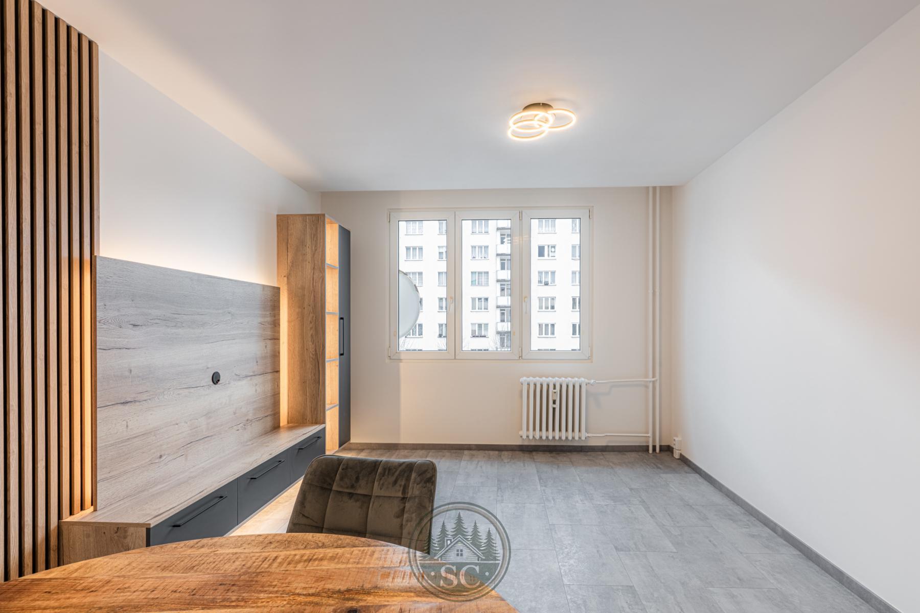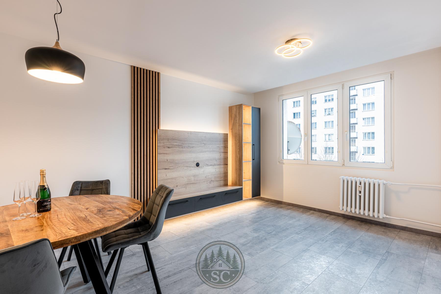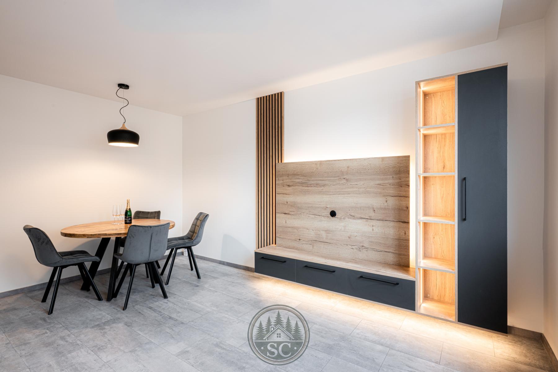 V obývacím pokoji se nachází truhlářem vyrobená TV stěna se skříňkou na míru, připravená k instalaci televize. Součástí je designové podsvícení ve dvou režimech lze zvolit podsvícení stěny, osvětlení skříňky, nebo obojí současně. Dále je zde umístěn nový masivní jídelní stůl v přírodním stylu se židlemi, který nabízí plnohodnotný prostor pro stolování.