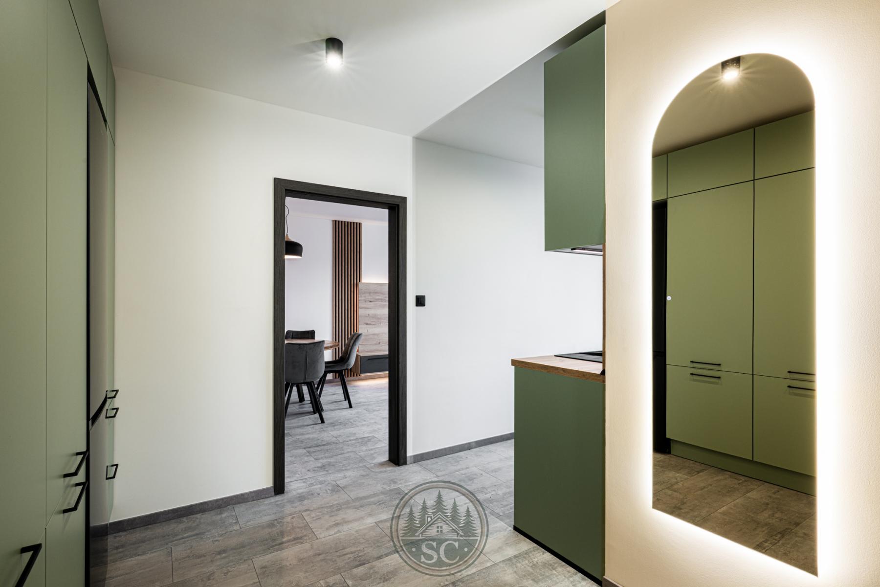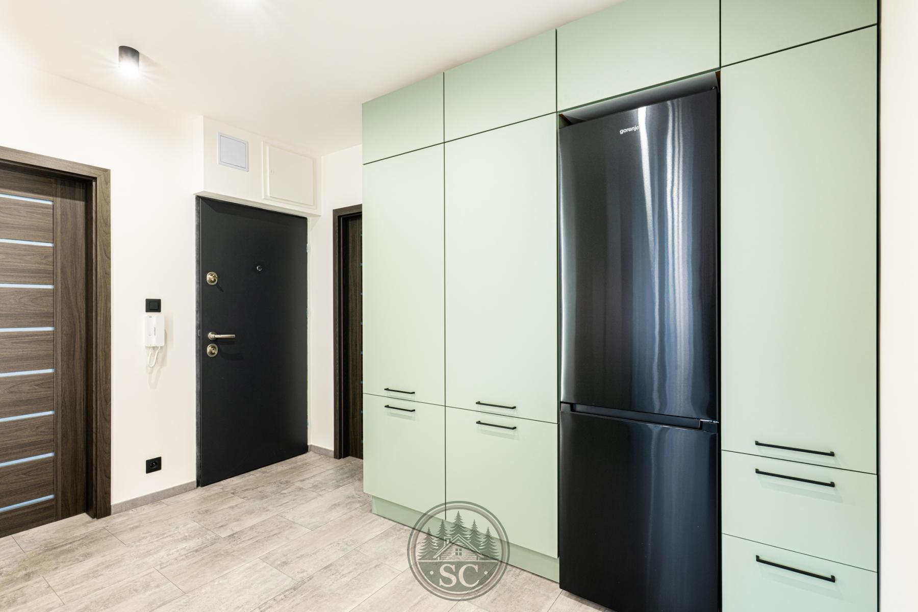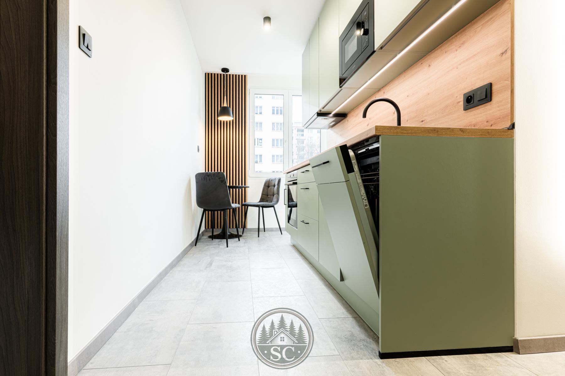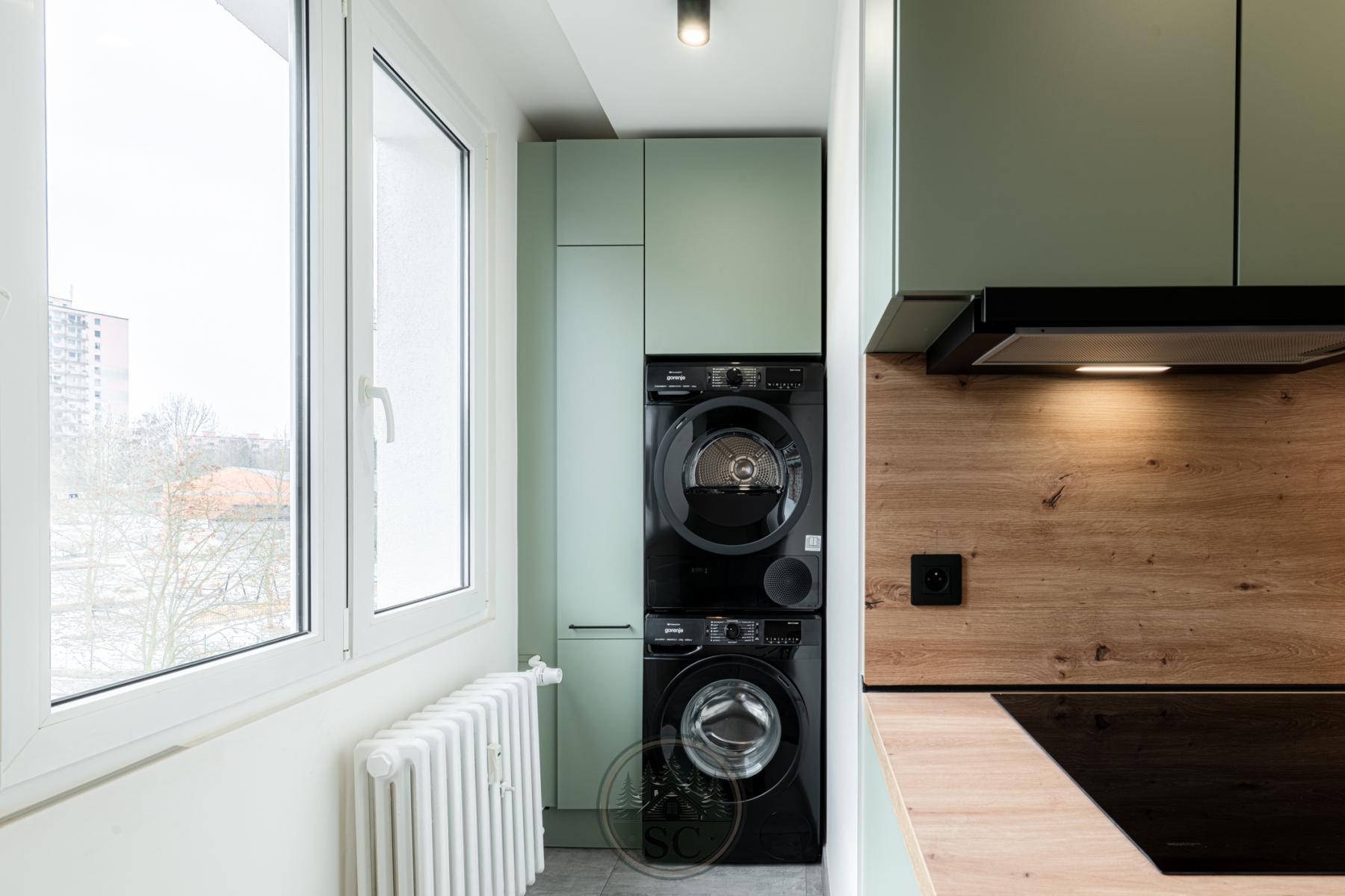 Dominantou bytu je kuchyňská linka vyrobená na míru, která maximálně využívá prostor. V kuchyňském koutě vznikl citlivě a elegantně oddělený prostor pro pračku a sušičku, navržený tak, aby přirozeně zapadal do celkového řešení bytu a nerušil vzhled interiéru. Kuchyňská linka, prací kout a vestavná skříň na chodbě jsou sladěny do jednotného designu v jemném zeleném odstínu, který bytu dodává osobitý a nadstandardní charakter.
