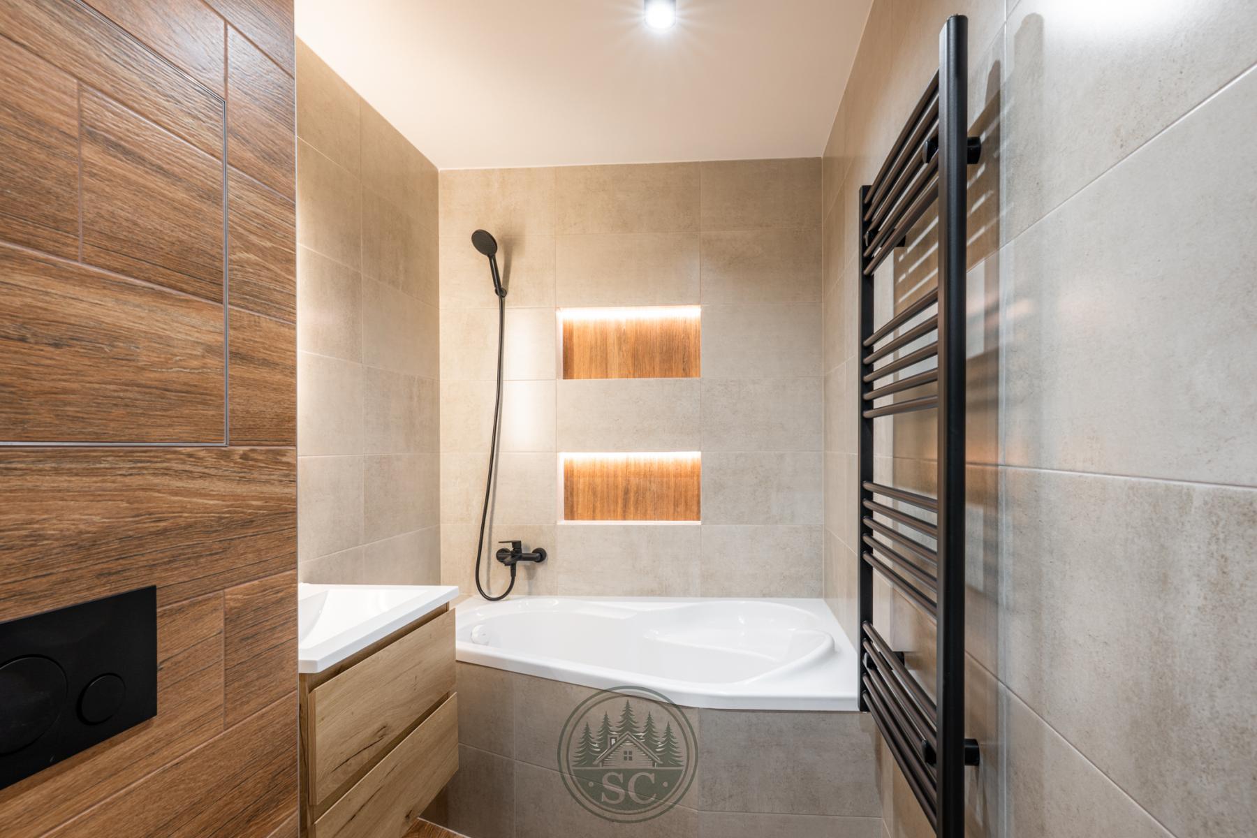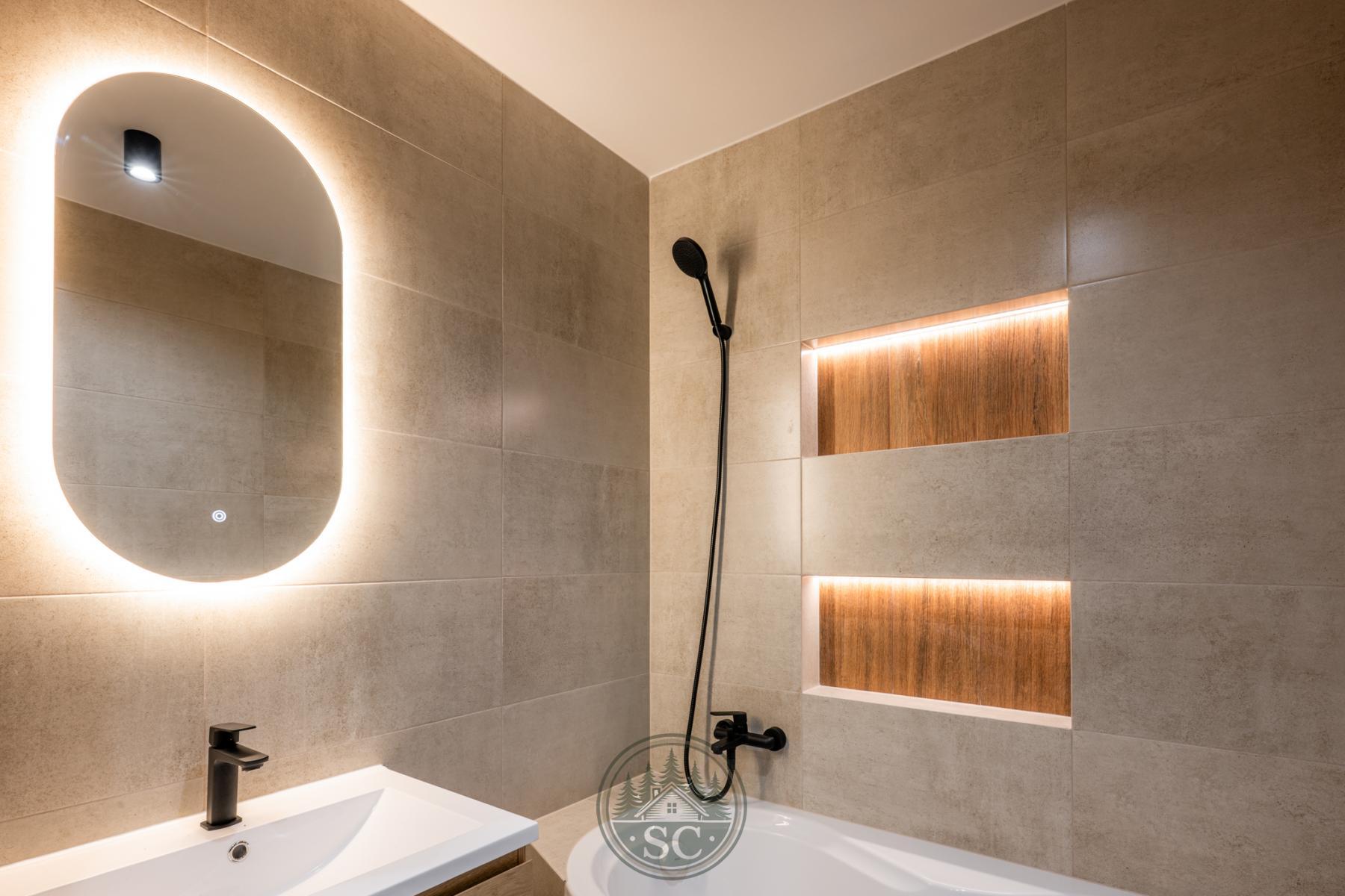 Koupelna je řešena s důrazem na detail a atmosféru. Nad vanou jsou vytvořeny dvě designové niky s integrovaným osvětlením. Zrcadlo nabízí tři režimy osvětlení (teplé, neutrální a studené světlo), celý prostor doplňují bodová svítidla. Samozřejmostí je závěsné WC a bidetová sprška.