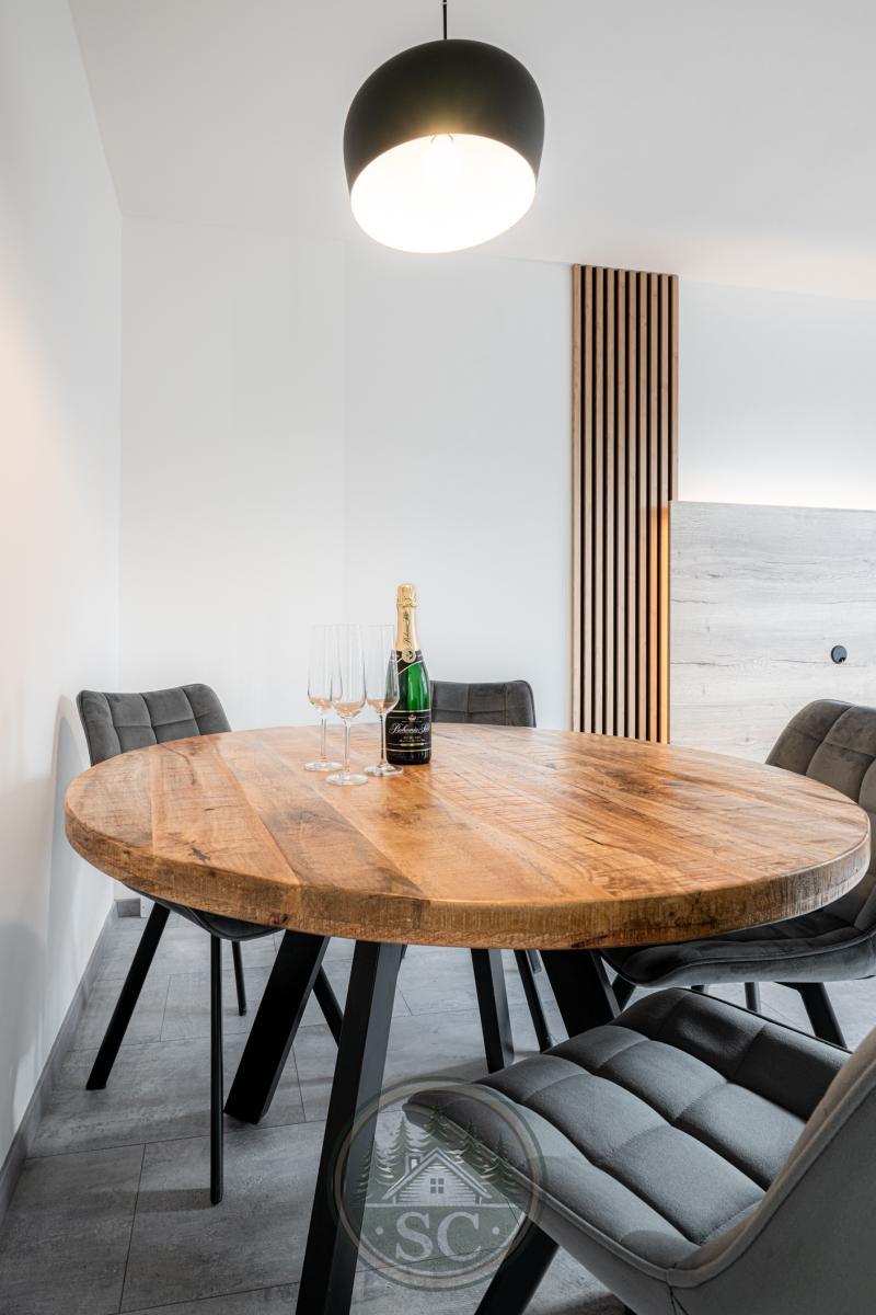 V kuchyni je dále umístěn menší stolek se dvěma židlemi, ideální pro rychlé posezení u kávy či snídaně.