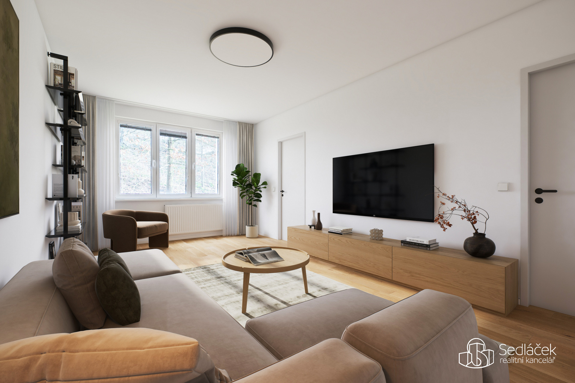 Součástí prezentace jsou také vizualizace kuchyně a obývacího pokoje, které ukazují možnou moderní podobu bytu po rekonstrukci.