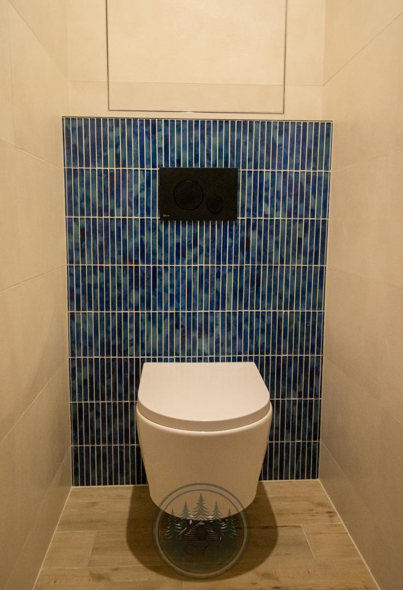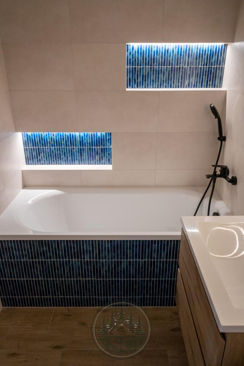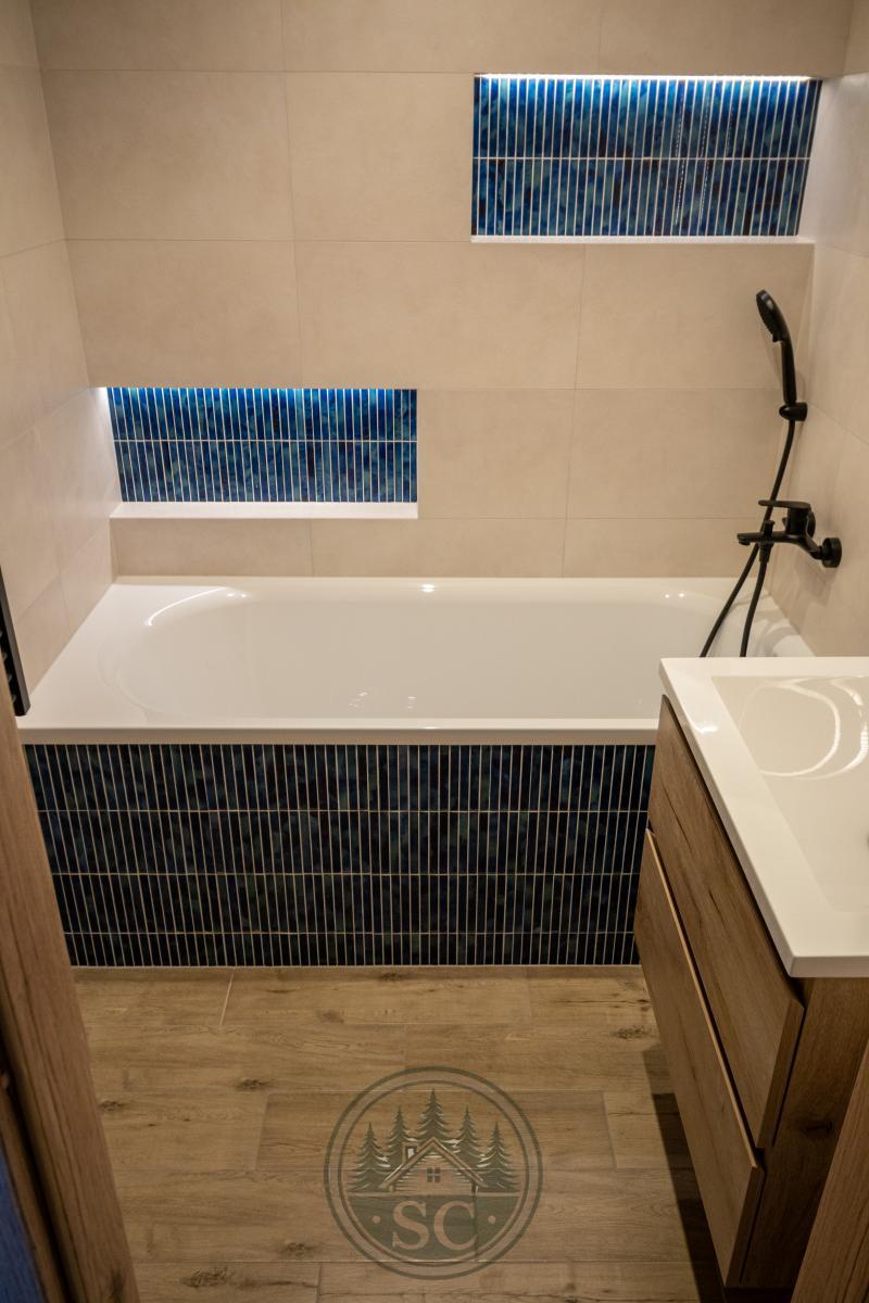 Koupelna nabízí vanu, podsvícené niky s jemným modrým akcentem, zrcadlo s volbou světelného tónu, černé baterie, topný žebřík a skříňky v dekoru dřeva.