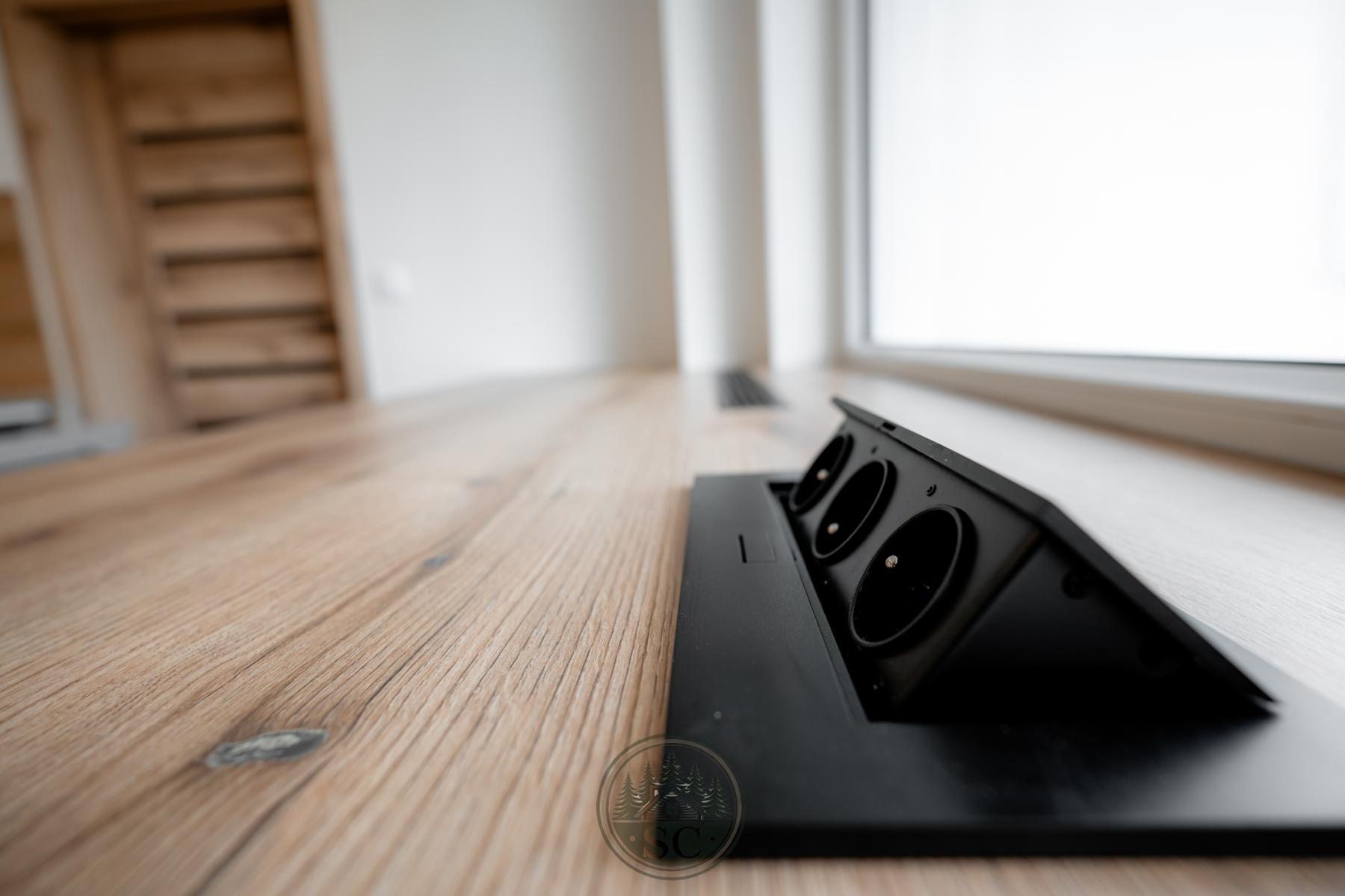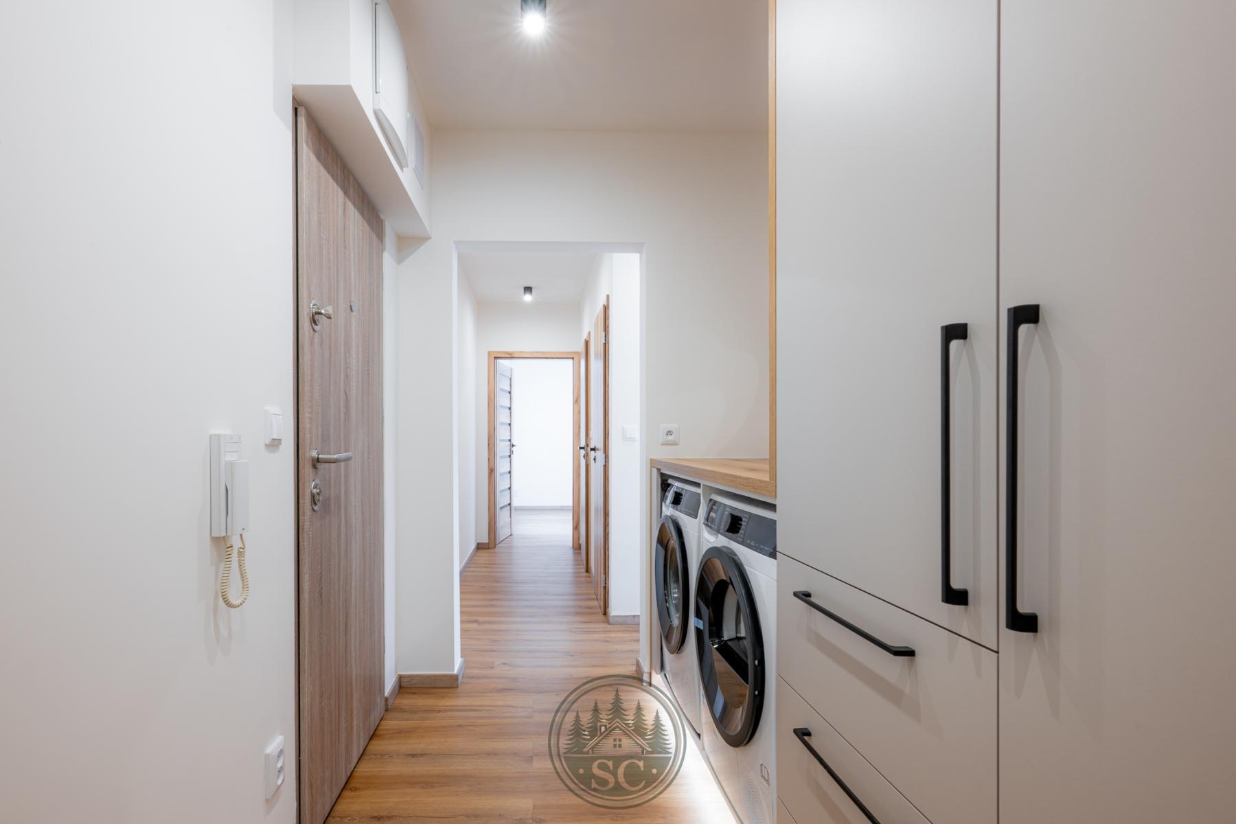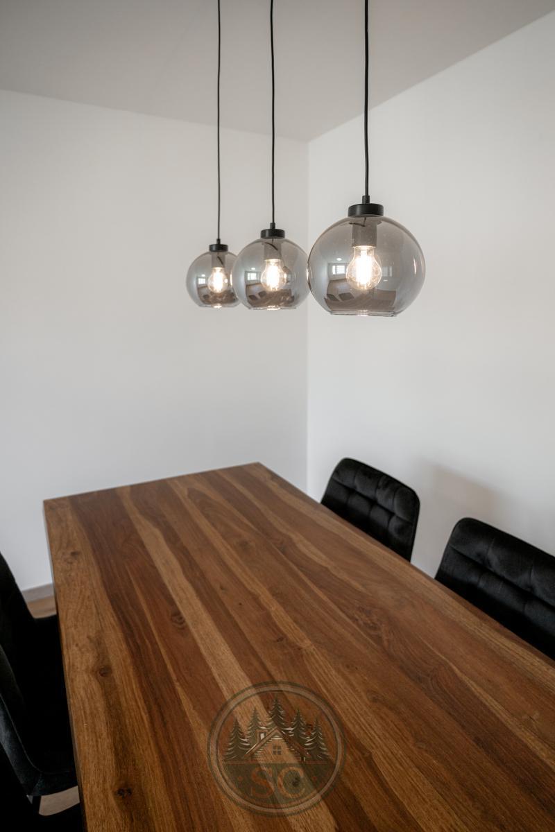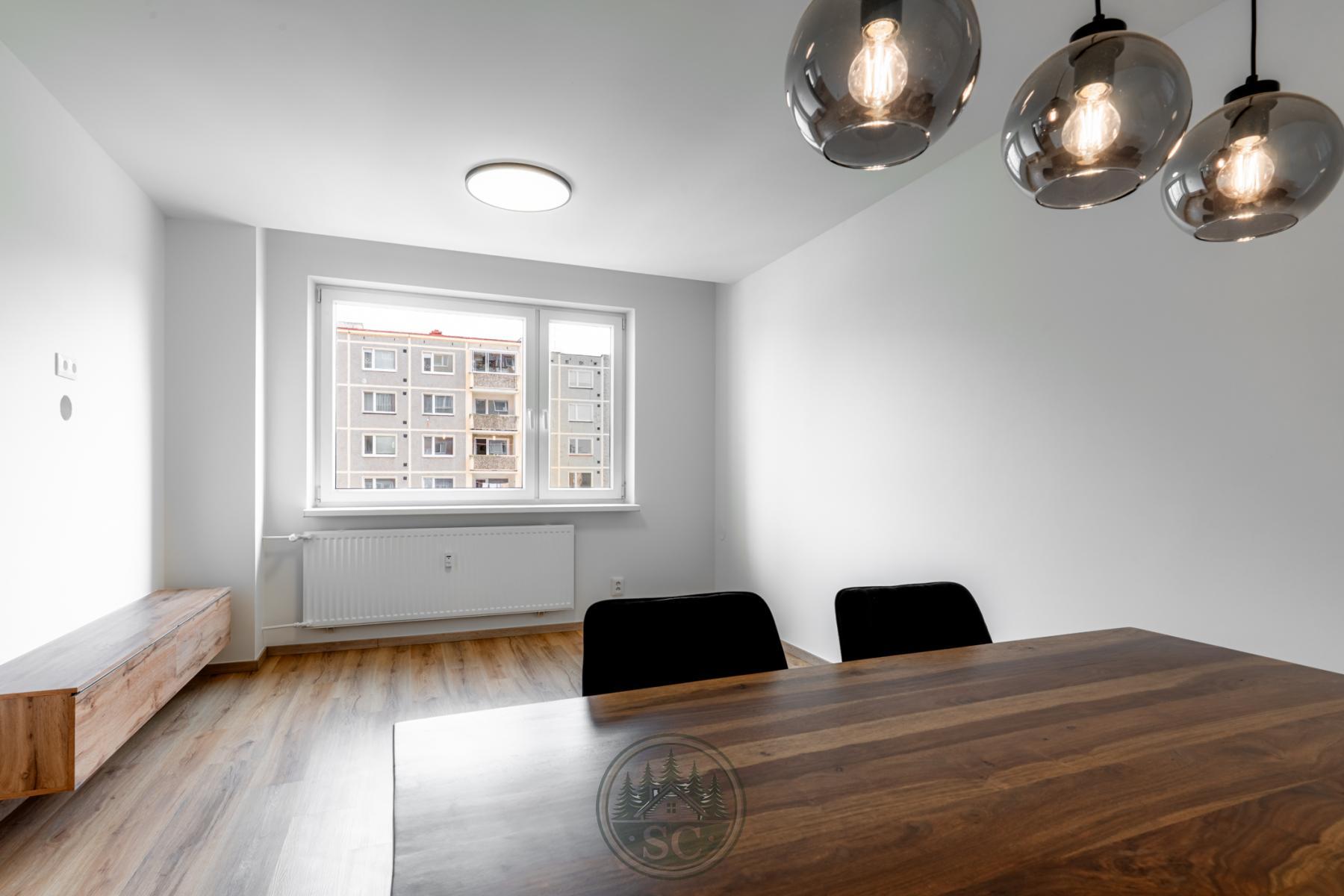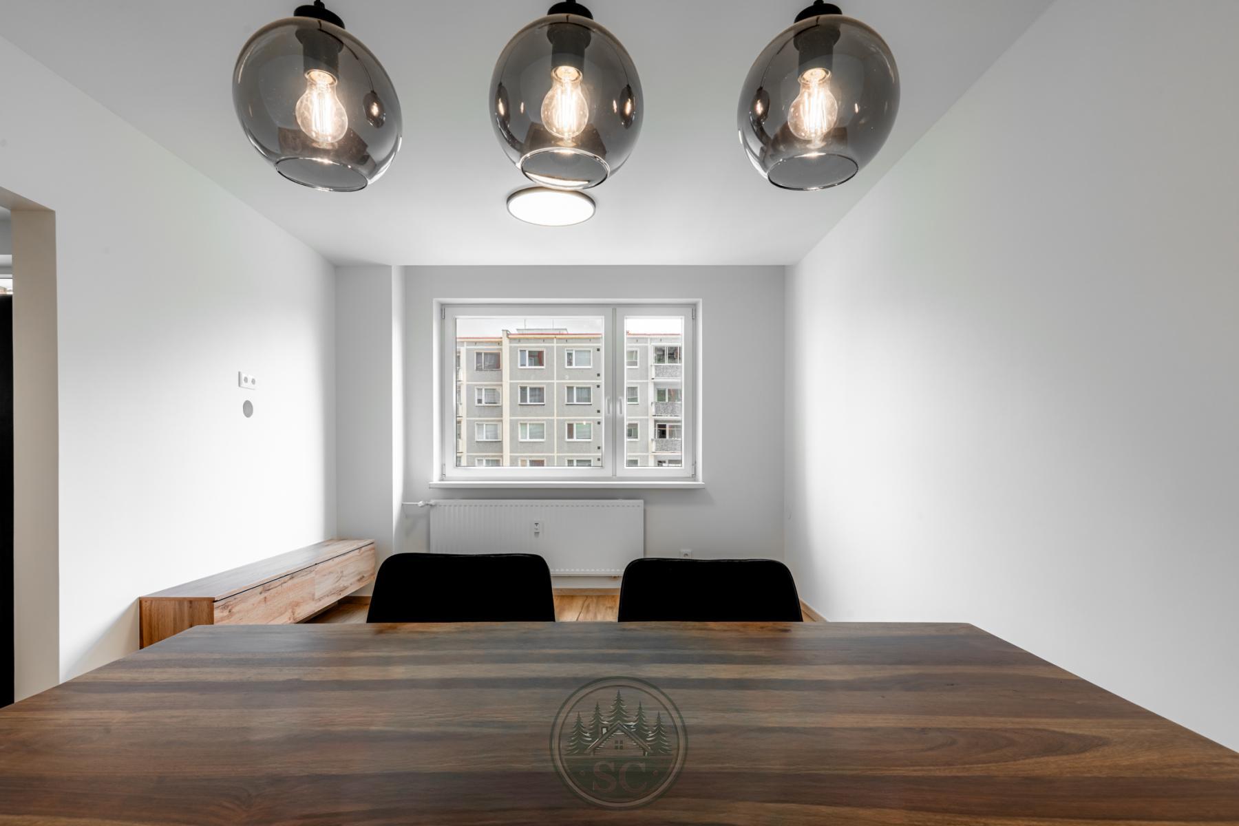 V bytě byly provedeny nové rozvody elektřiny i vody, proběhla kompletní nivelace podlah a následná pokládka vinylu se zvýšenou mechanickou odolností. Součástí je také jídelní stůl z masivu, designové osvětlení v podobě zavěšených kouřových svítidel a televizní stěna.