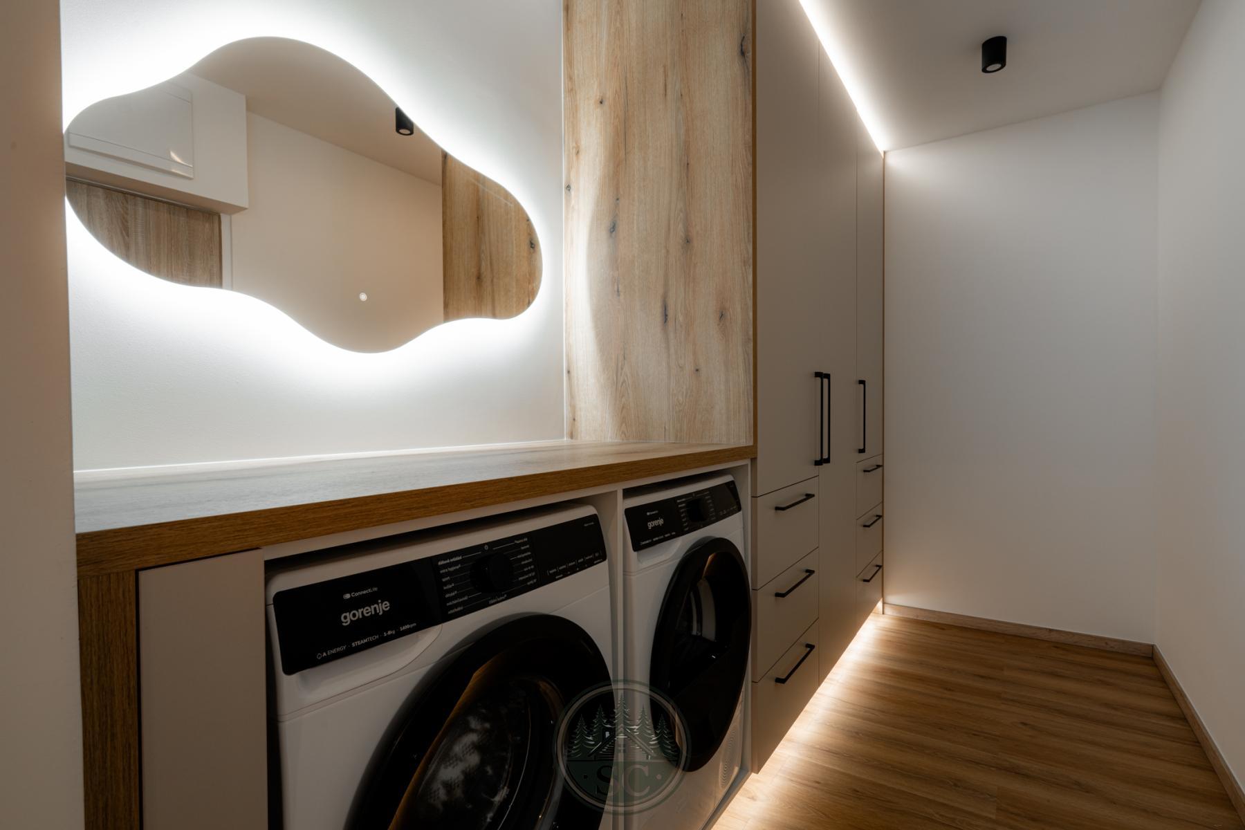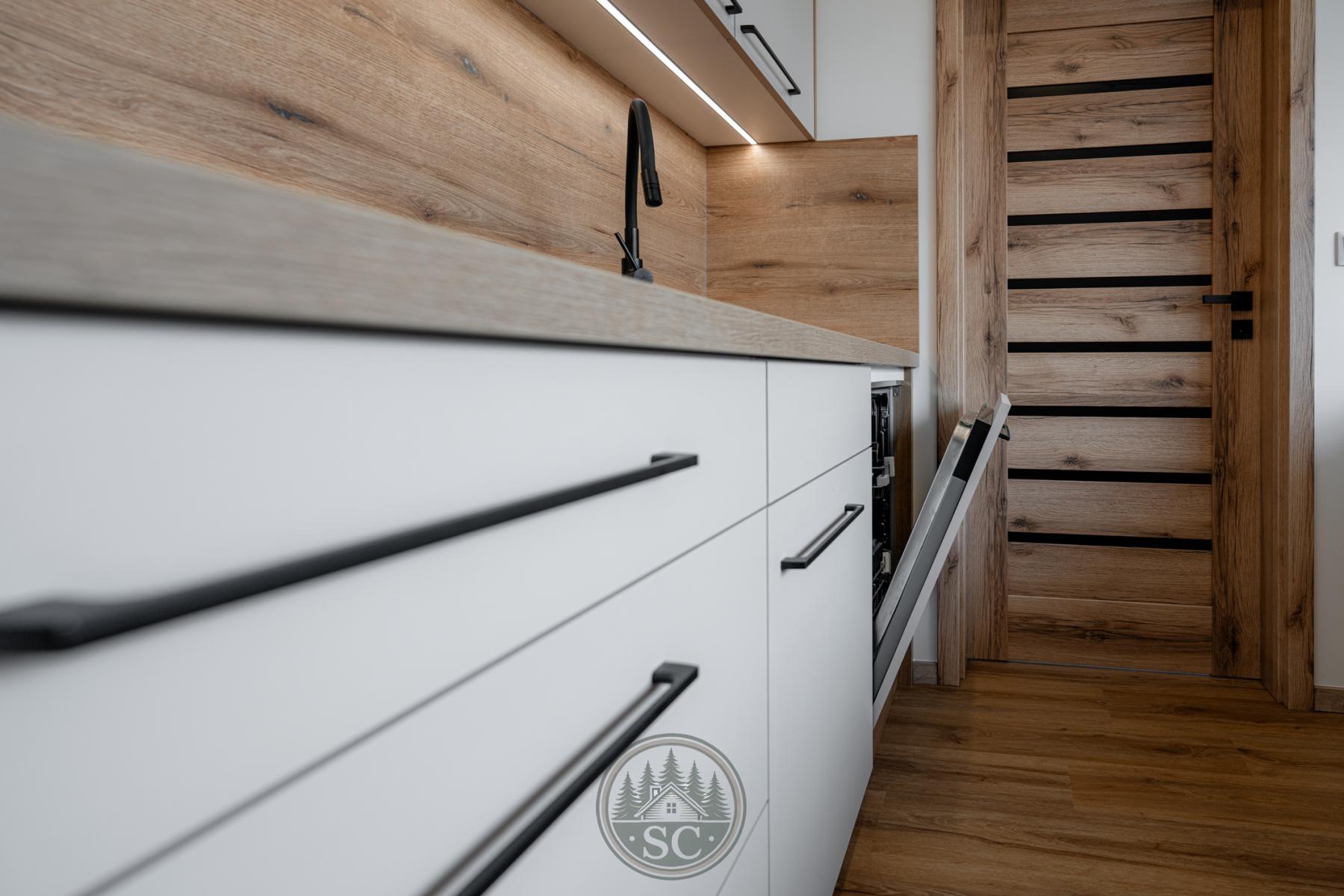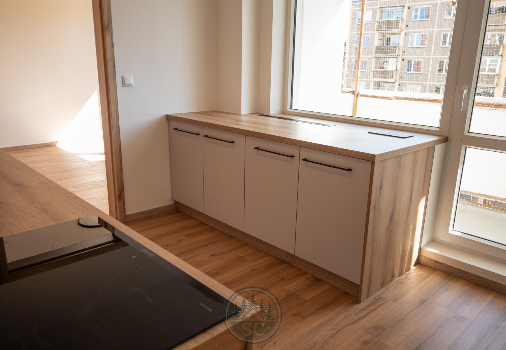 Kuchyňská linka je chytře rozdělena do dvou celků. Hlavní část nabízí plné vybavení - vestavnou myčku, indukční varnou desku, troubu a digestoř. Druhá část pod oknem vytváří příjemný pracovní prostor s přímým vstupem na lodžii. Nechybí zde ani praktické výklopné zásuvky.