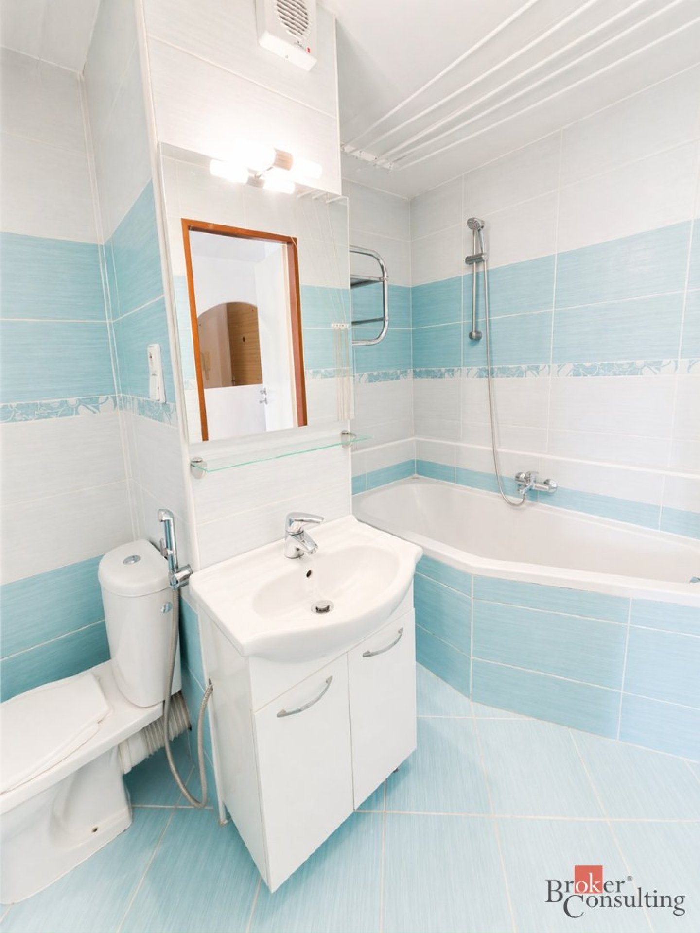 Samotný byt je ve velmi dobrém stavu. Disponuje kuchyňskou linkou vyrobenou na míru s integrovaným osvětlením, přičemž kuchyně je plně vybavena spotřebiči – k dispozici je sporák s elektrickou varnou deskou, myčka nádobí i lednice. Velkou výhodou bytu je kompletně nově zrekonstruované zděné jádro. Koupelna je vybavena vanou a toaletou. V obávacím pokoji sedačka a pohovka.