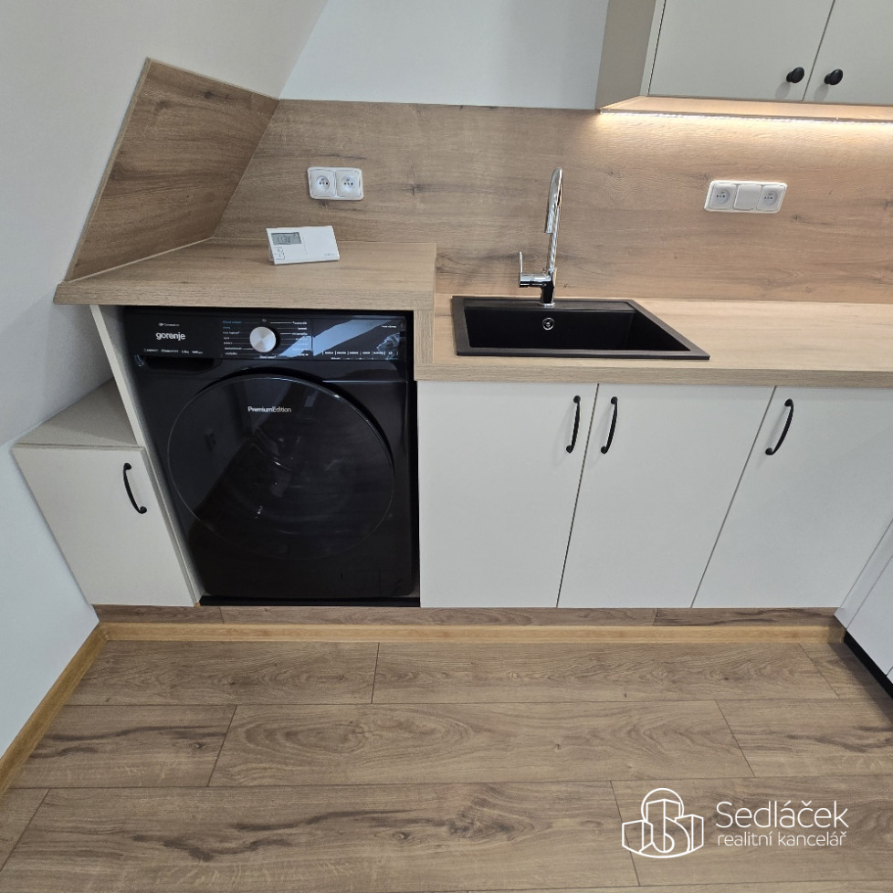 Součástí bytu je nová kuchyňská linka se spotřebiči, laminátové podlahy a koupelna se sprchovým koutem, umyvadlem a WC. Vytápění zajišťuje elektrický kotel se zásobníkem umístěný přímo v bytě, což umožňuje regulaci spotřeby podle vlastních potřeb.