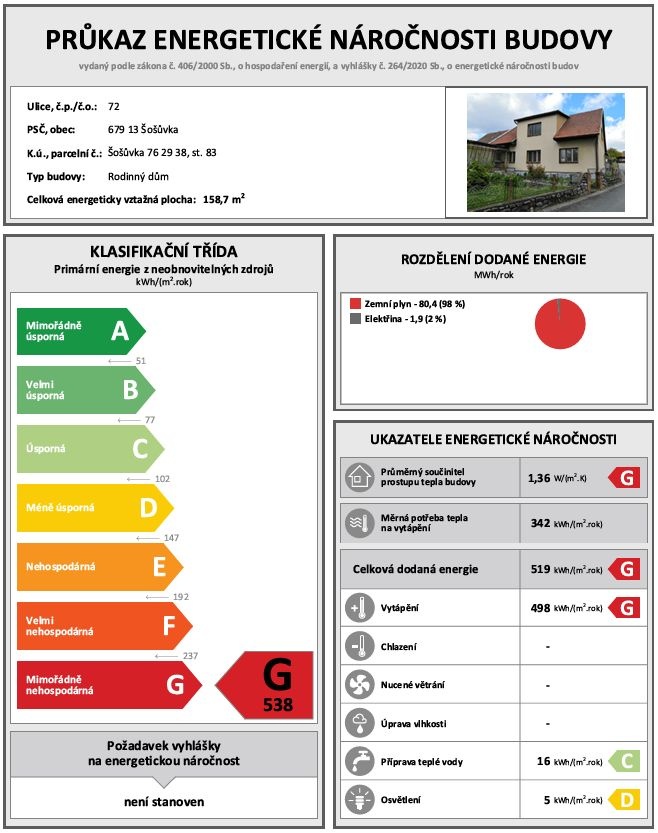- Energetická náročnost budovy: G - Mimořádně nehospodárná