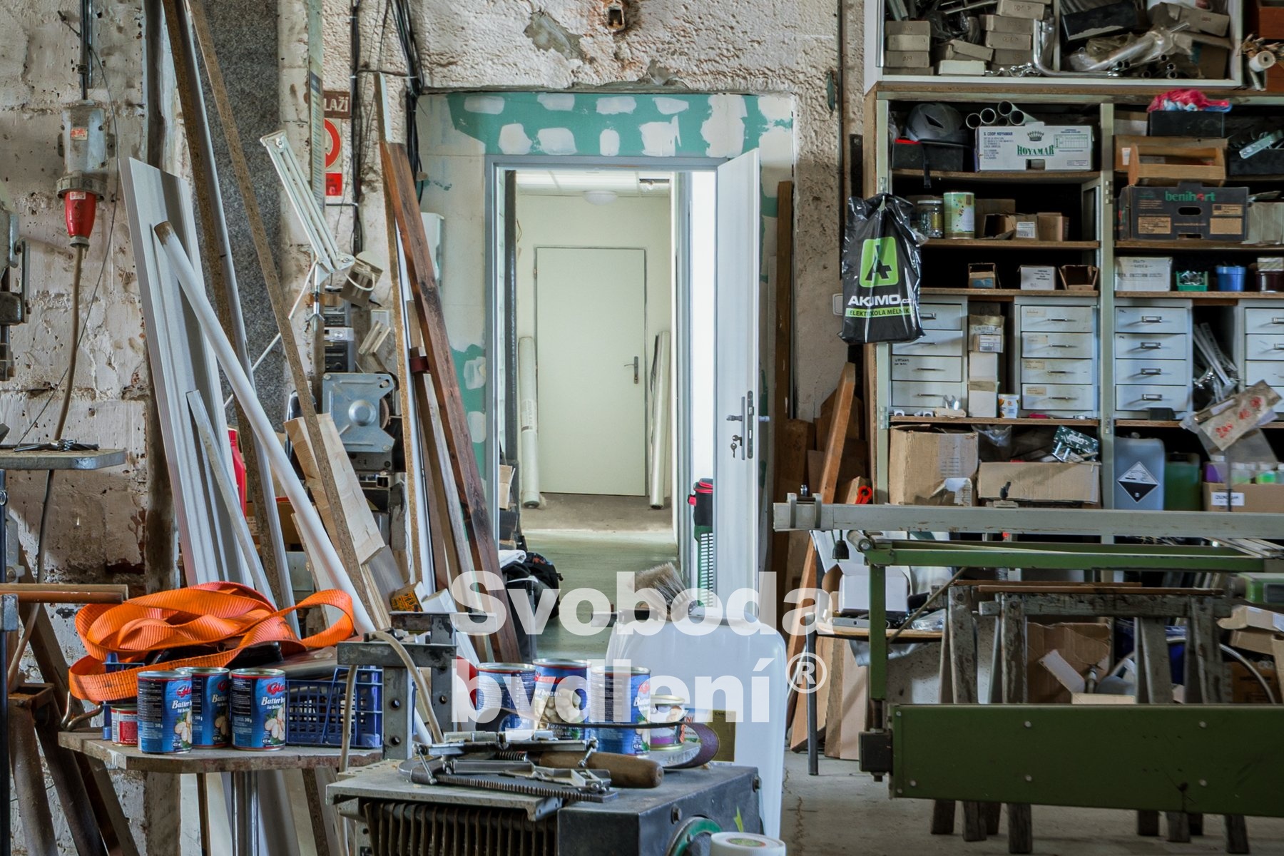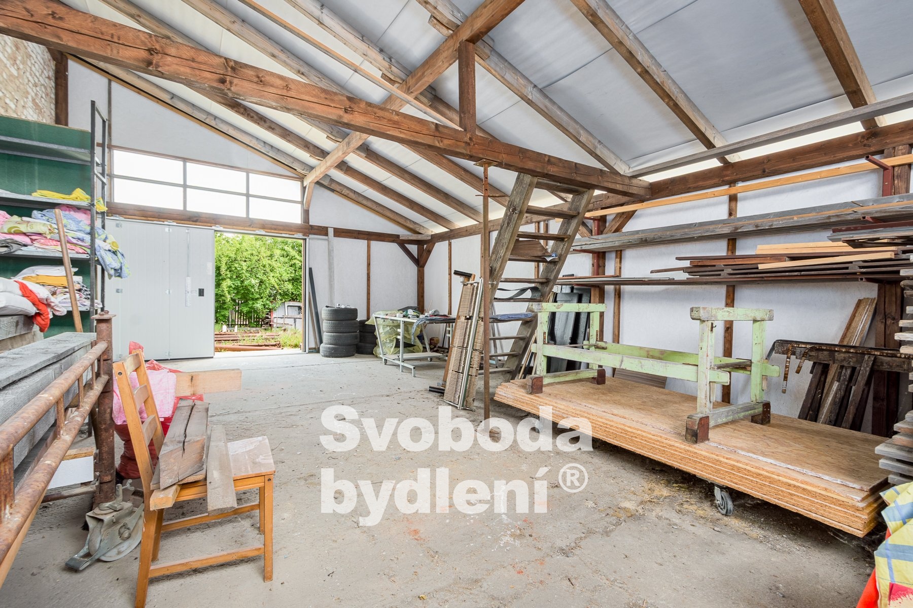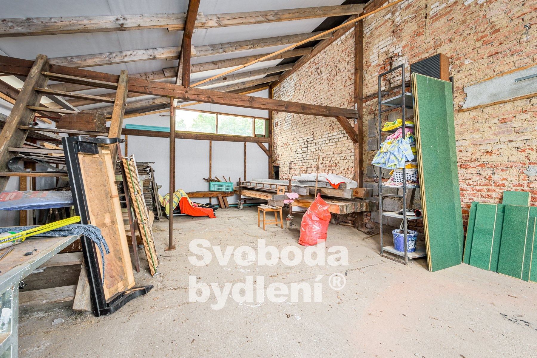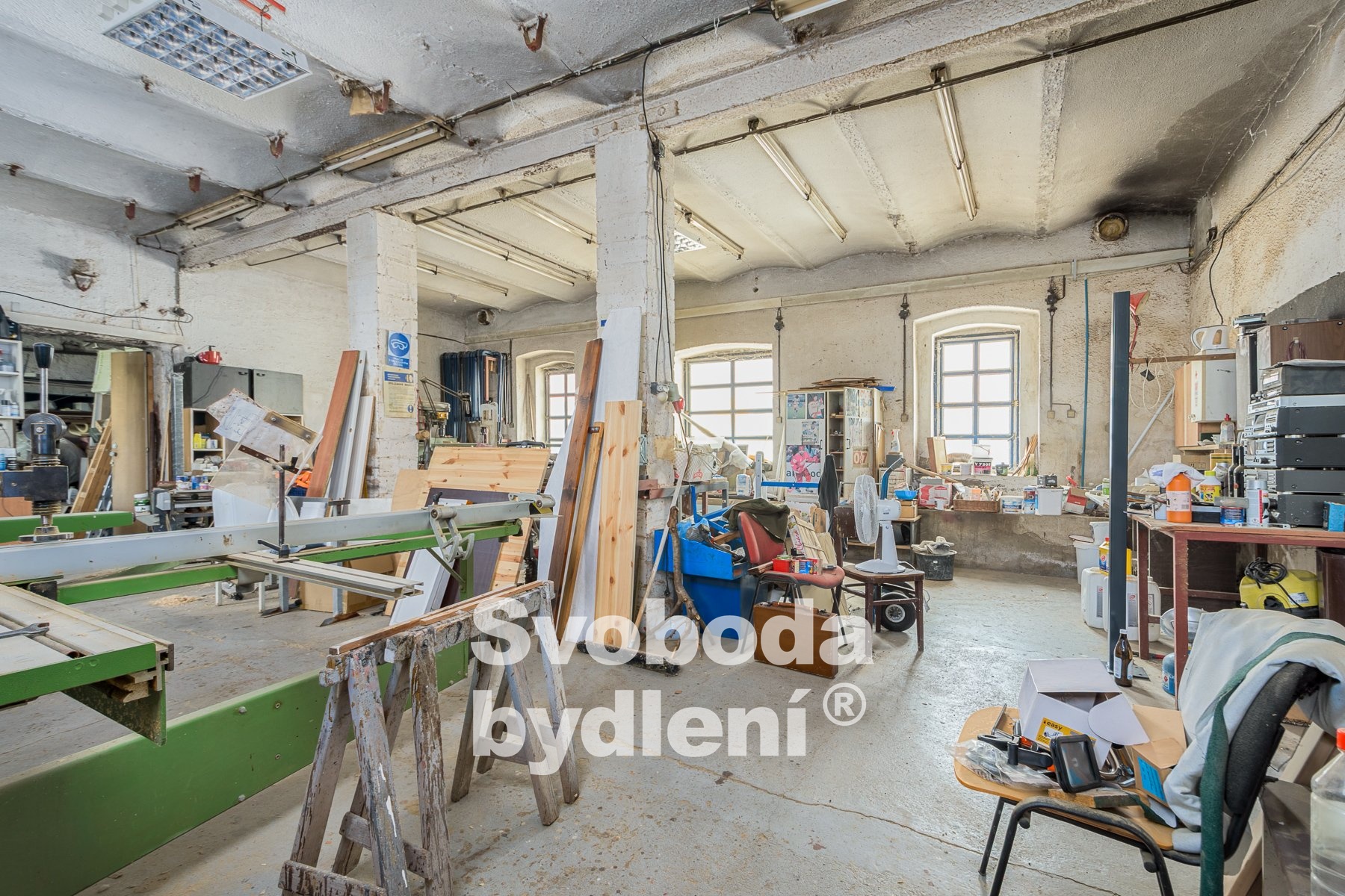Druhá část objektu, přebudovaná na truhlářskou montážní dílnu se sociálním zařízením a s kancelářemi, stavebně navazuje na dům a je propojená uzamykatelnými dveřmi. Nalezneme zde dva velké prostory určené pro truhlářskou výrobu s veškerým vybavením, které je možné po dohodě přenechat. Další 3 místnosti jsou využitelné jako kanceláře (včetně kuchyněk) a provozní zázemí, je zde také koupelna a dvě toalety. Celková plocha této části stavby činí cca 261m2 plus půda cca 282m2 (celkem cca 543m2). Truhlárna disponuje celkem cca 142m2 a výškou stropu cca 3,5m. Celková plocha kancelářské části je cca 119m2 (místnosti cca 77m2).