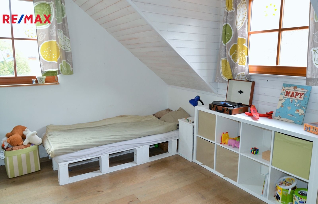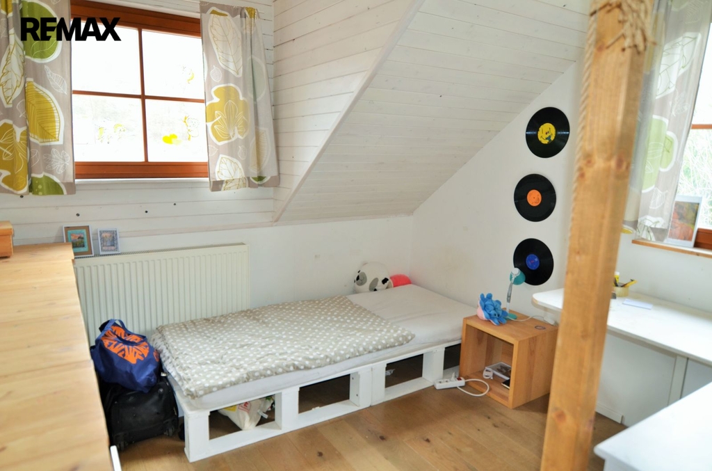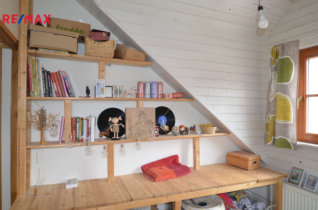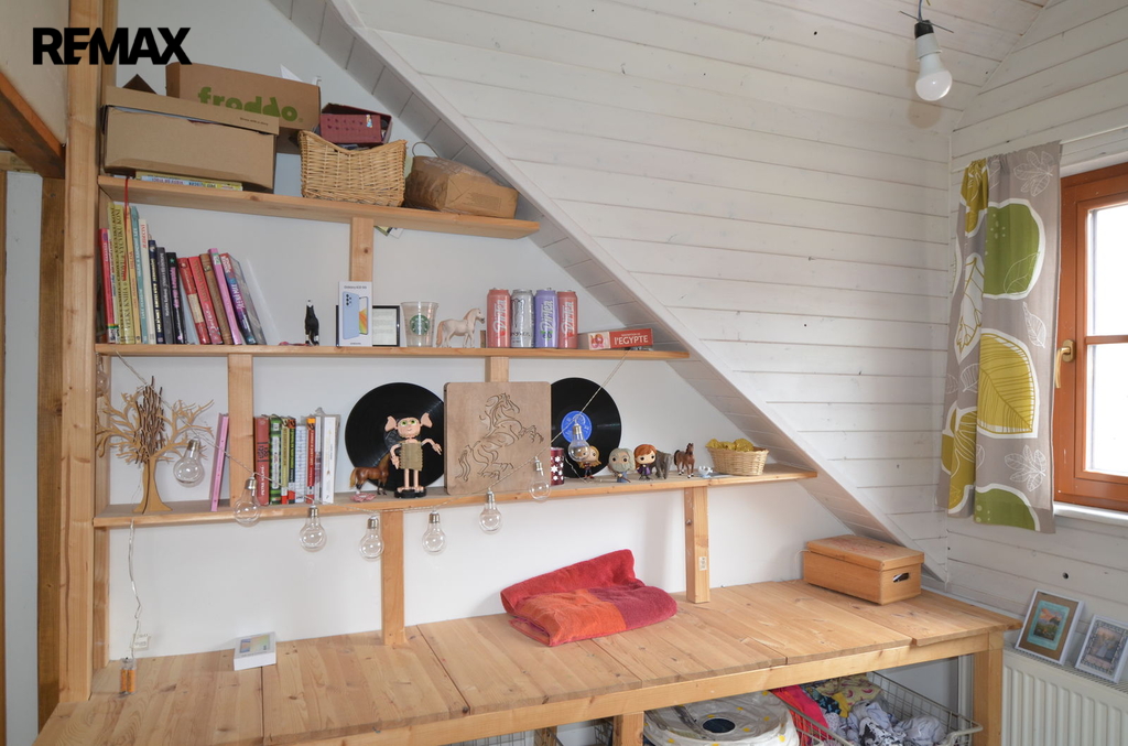 Dům má v přízemí velký rodinný prostor s kuchyní a jídelnou, kout s pracovnou/knihovnou, dále je v přízemí ložnice a koupelna s WC a pračkou. V horním patře jsou 3 dětské pokoje a druhé WC.
