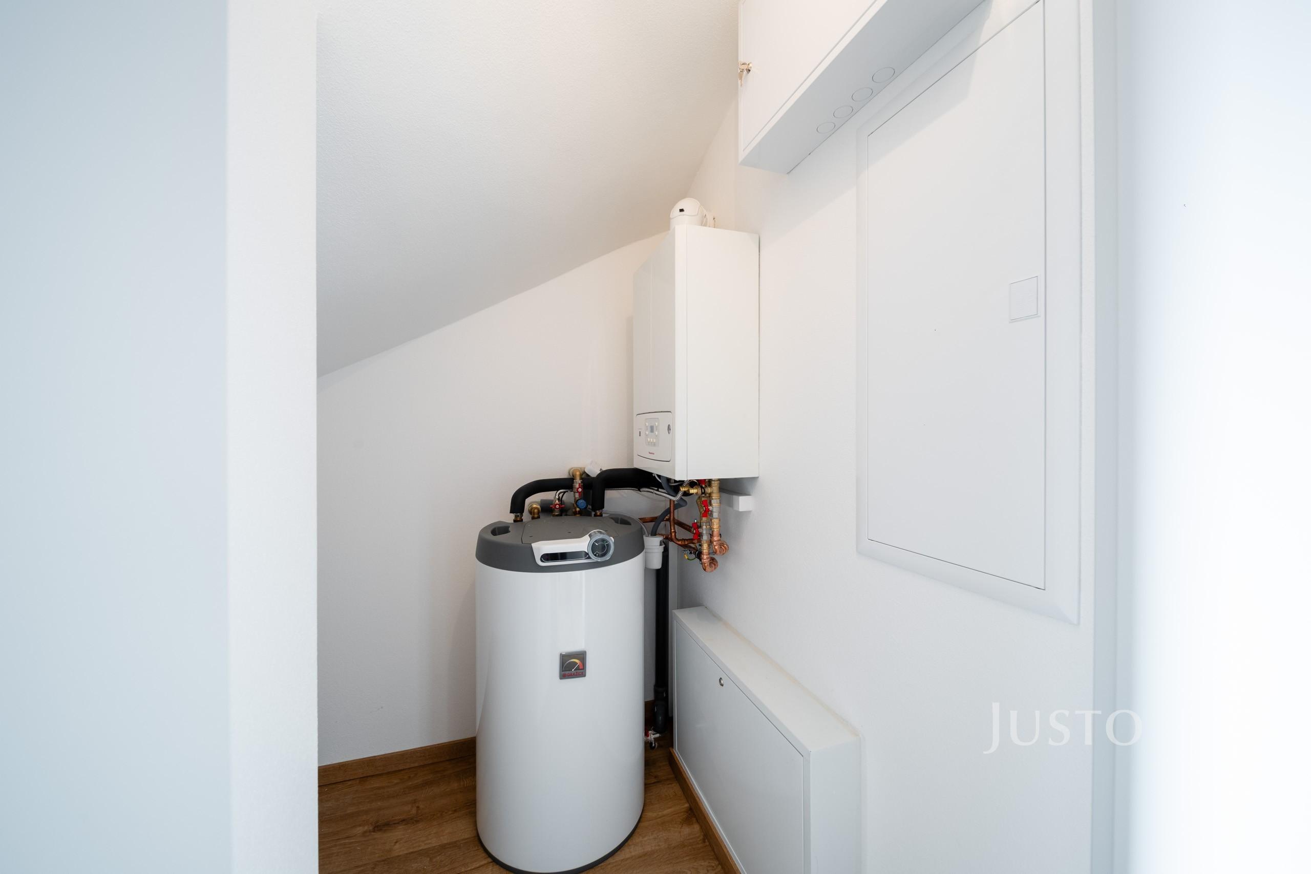 O vytápění se stará plynový kondenzační kotel s podlahovým vytápěním. Díky kvalitnímu zateplení dům splňuje energetickou třídu B – velmi úsporná, což znamená nízké provozní náklady.