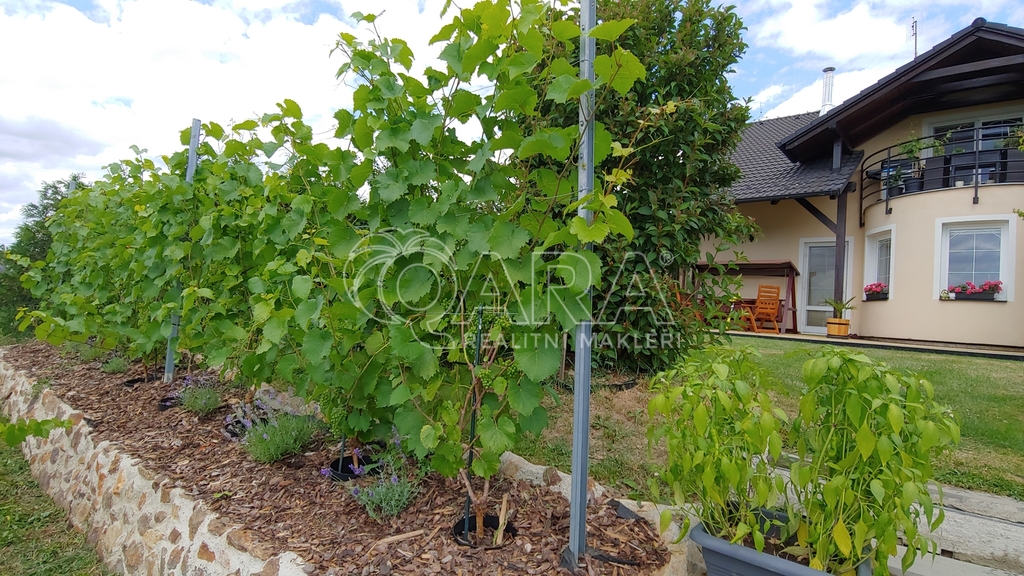Z obývacího pokoje je vstup na zastřešenou terasu a zahradu, kde se nachází skleník, okrasné dřeviny i malá vinice. Zeleň poskytuje naprosté soukromí a vytváří příjemnou atmosféru pro relax i rodinná setkání.