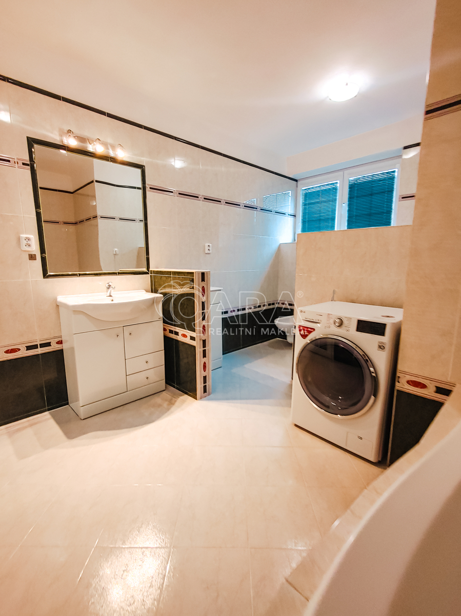 Dále je zde koupelna s vanou, bidetem a toaletou, velká šatna a především obývací pokoj s krbem, propojený s moderní kuchyní a jídelním koutem. Kuchyně je plně vybavena vestavnými spotřebiči, navazuje na ni praktická spižírna a půlkruhový výklenek ideální pro rodinný jídelní stůl.