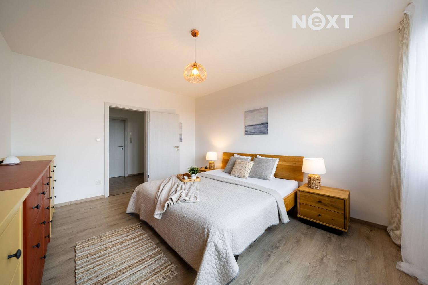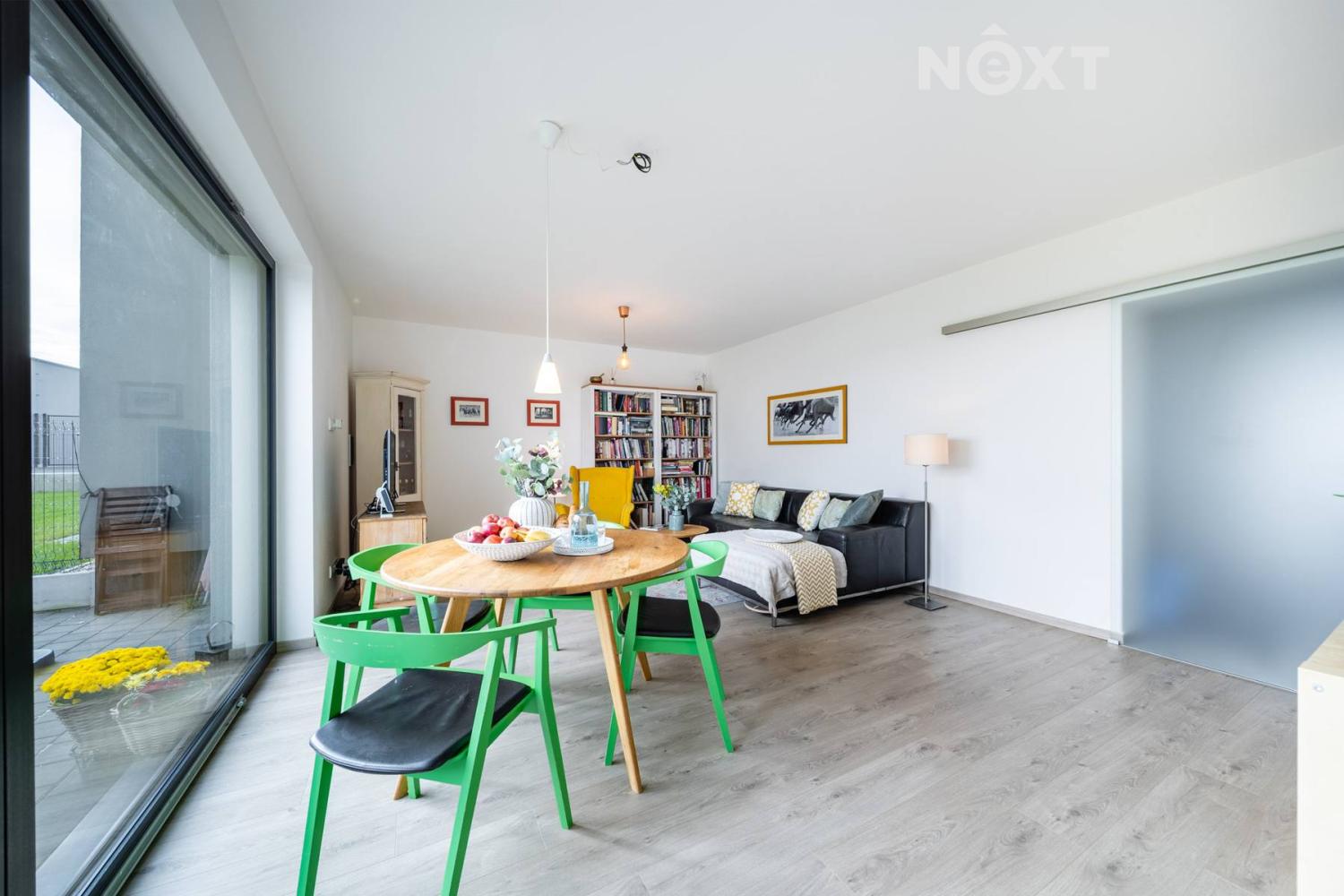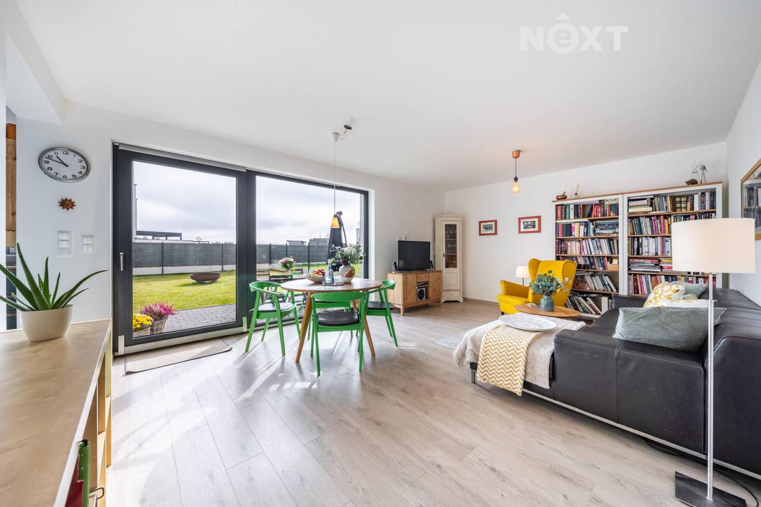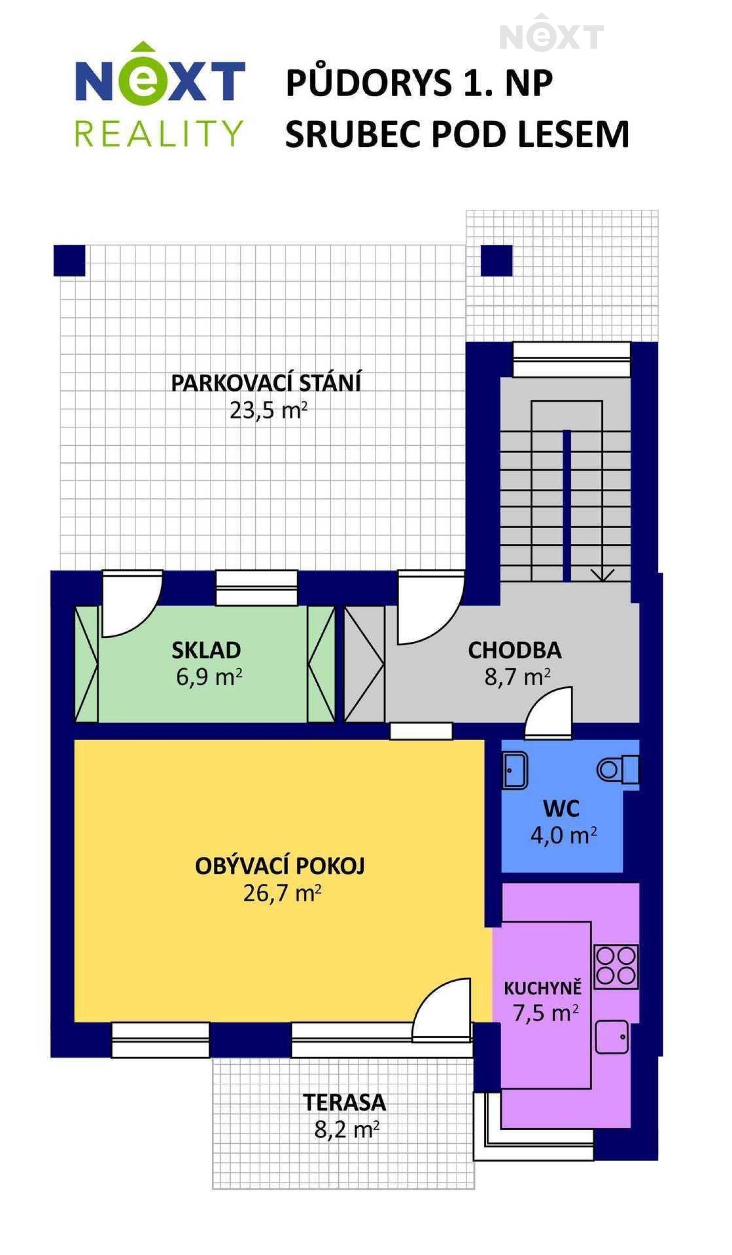 Při příjezdu k domu vás zaujmou dvě krytá parkovací stání o velikosti 23,5 m² a praktický venkovní sklad o 6,99 m², ideální na kola nebo sportovní vybavení. Vstupní hala o 8,79 m² navazuje na světlý obývací pokoj s kuchyňským koutem o 34,25 m², který je srdcem celého domu. Kuchyně je výrazným designovým prvkem – masivní dřevo, kožené úchytky, ručně působící detaily a mimořádně příjemná barevnost tvoří prostor, který působí domácky a zároveň moderně. Z obývací části vedou velké prosklené dveře na terasu o 8,23 m² a na zahradu, které díky své orientaci přivádějí do interiéru dostatek denního světla po celý den.