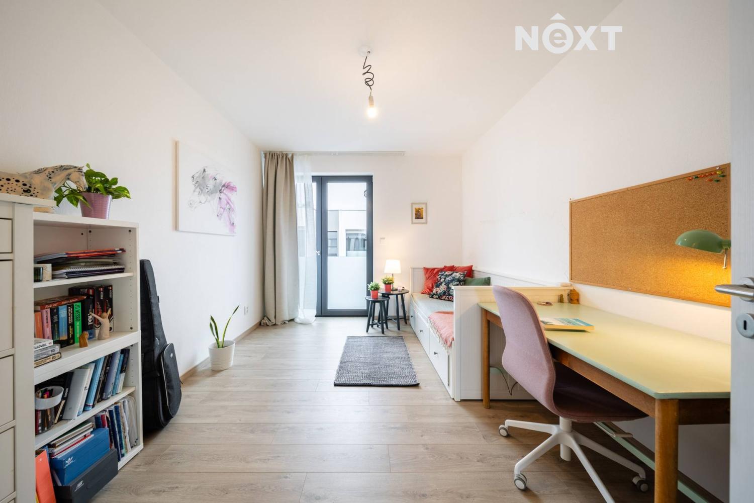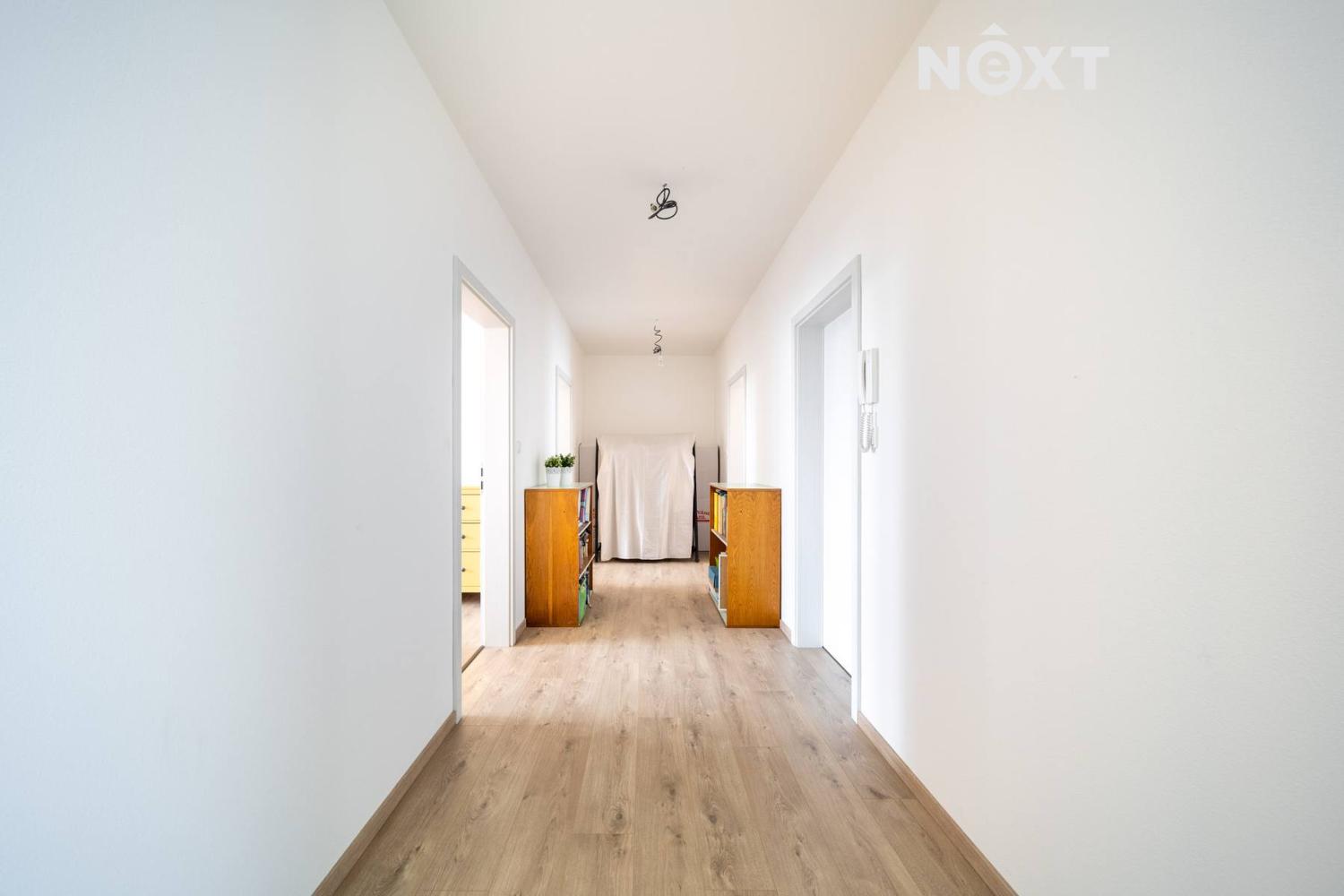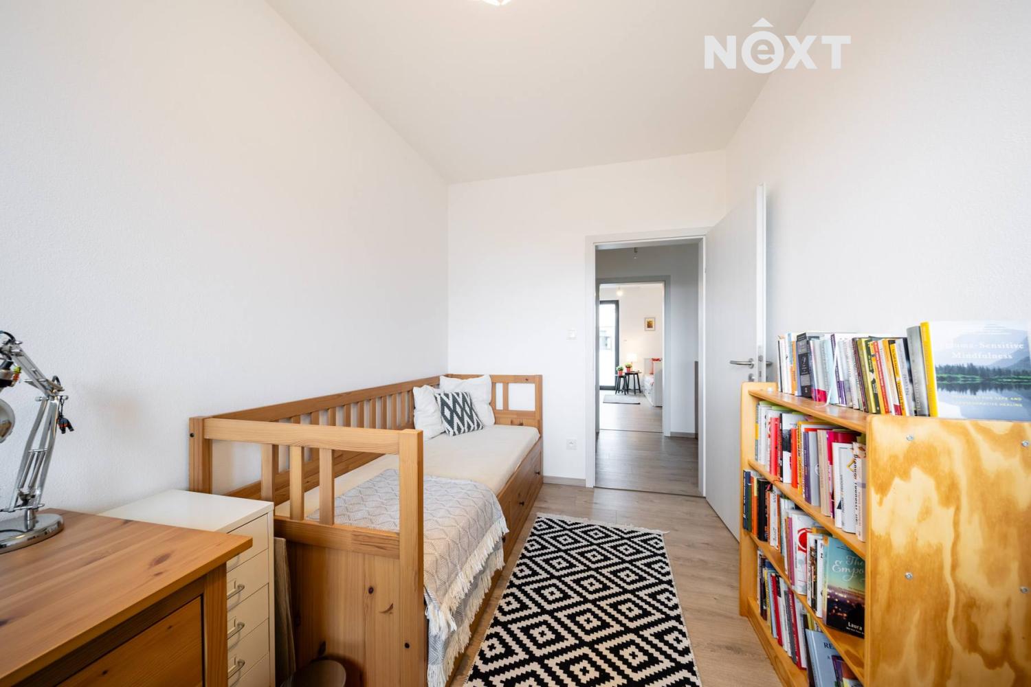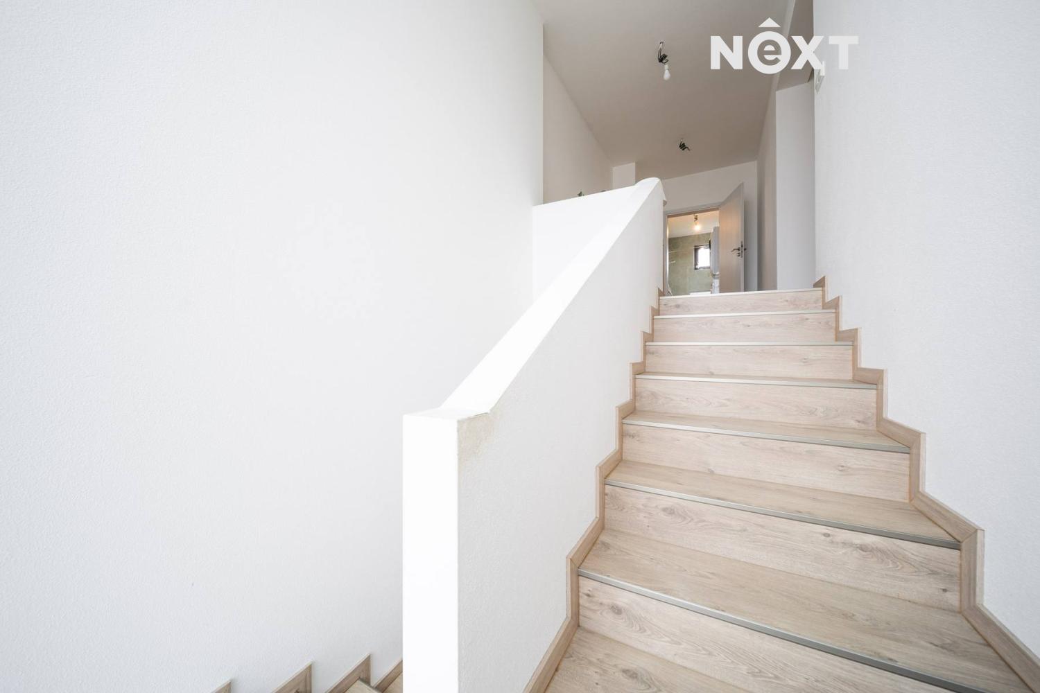 Elegantní prosklené schodiště vede do prvního patra, kde se nachází soukromá část domu. Hlavní ložnice o 16,09 m² působí vzdušně a nabízí klid s příjemným výhledem. Druhý pokoj o 13,95 m² je ideální jako dětský pokoj nebo pracovna. Třetí pokoj o velikosti 12,6 m² může sloužit jako druhý dětský pokoj, hobby místnost nebo pracovna pro dva. Nechybí ani čtvrtá místnost o 9,89 m², vhodná jako šatna, menší pracovna nebo pokoj pro hosty. Koupelna v patře má 7,59 m², je vybavena vanou i sprchovým koutem a díky oknu působí příjemně, svěže a umožňuje přirozené větrání.