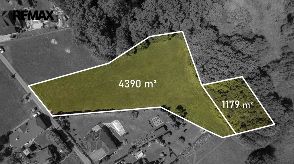 Pozemek tvoří dvě samostatné parcely. První o rozloze 4390 m², z čehož je 1500 m² určeno k zastavění jedním nebo dvěma domy. Druhá parcela je lesním pozemkem o výměře 1179 m². Větší část pozemku je téměř rovinatá až mírně svažitá, což usnadňuje výstavbu i využití. Elektřina je již přivedena na pozemku a zdroj vody bude řešen dvěma vrty. Pozemek je možné koupit i bez lesa.