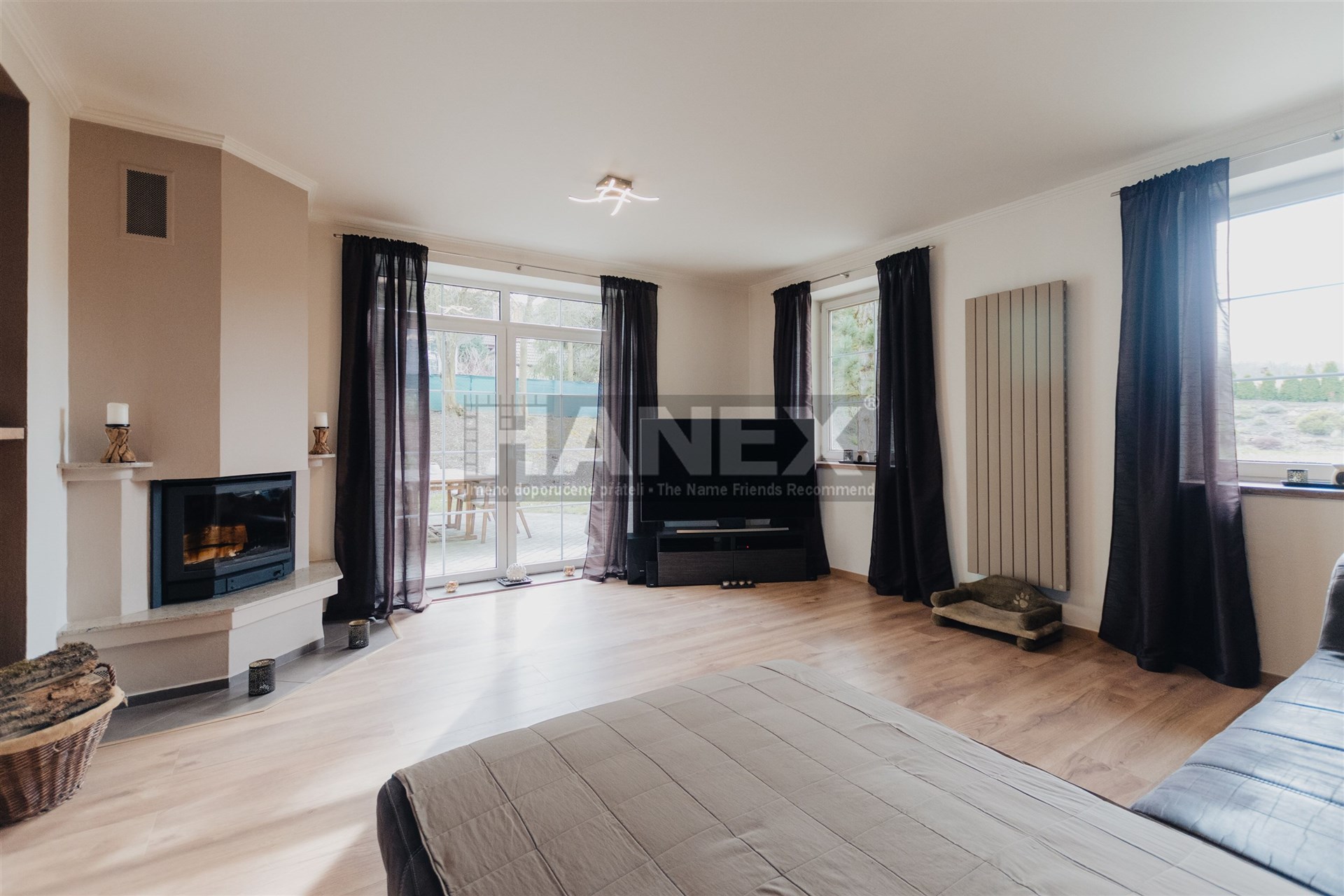 Kuchyň je moderní, plně vybavená a nabízí dostatek úložných prostor i přímý vstup na terasu. Praktický snídaňový pult odděluje kuchyň od jídelní části, kde se nachází jídelní stůl pro 8 osob. Obývací pokoj o velikosti 21 m2 je příjemným místem k relaxaci i setkávání s přáteli. Velká francouzská okna vedou na terasu, ideální pro grilování a letní posezení. Atmosféru dotváří rohová krbová kamna.
