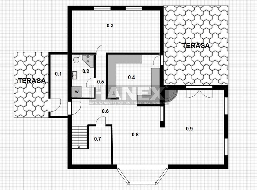 Zde se nachází prostorný pokoj pro hosty, který může sloužit také jako pracovna či domácí posilovna, a sousední koupelna v přízemí (sprchový kout, WC, umyvadlo a prostor pro pračku). Dále míjíme schodiště a pokračujeme do hlavního obytného prostoru, který tvoří kuchyň, jídelna a obývací pokoj.