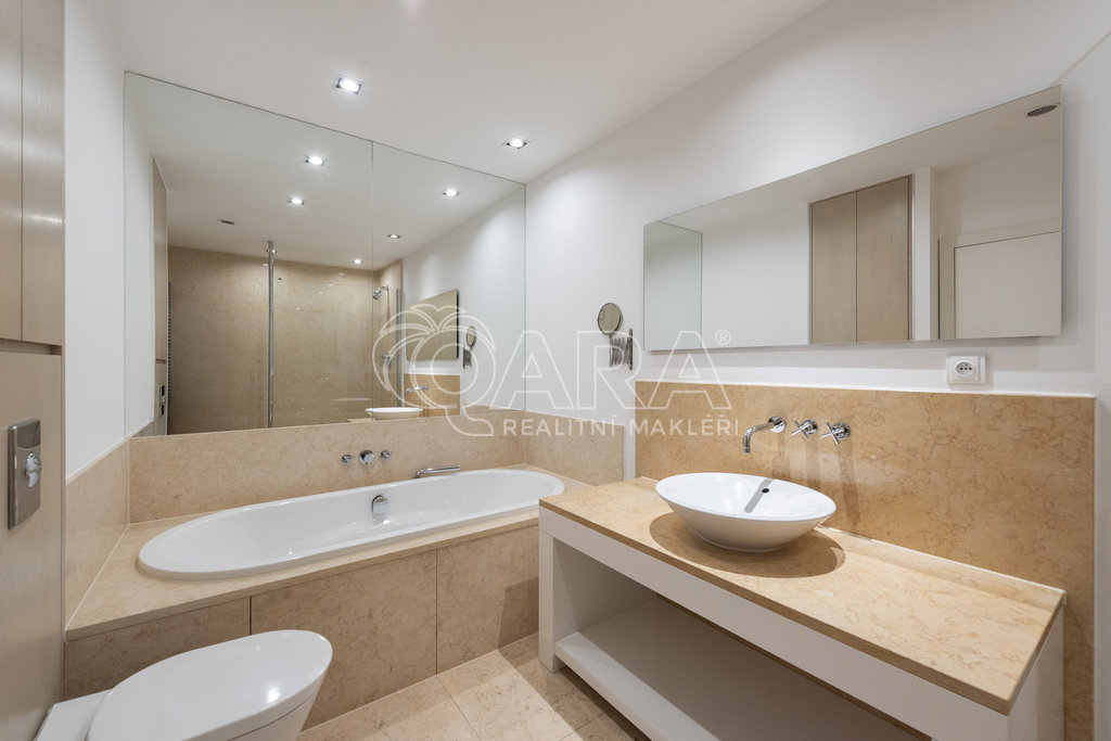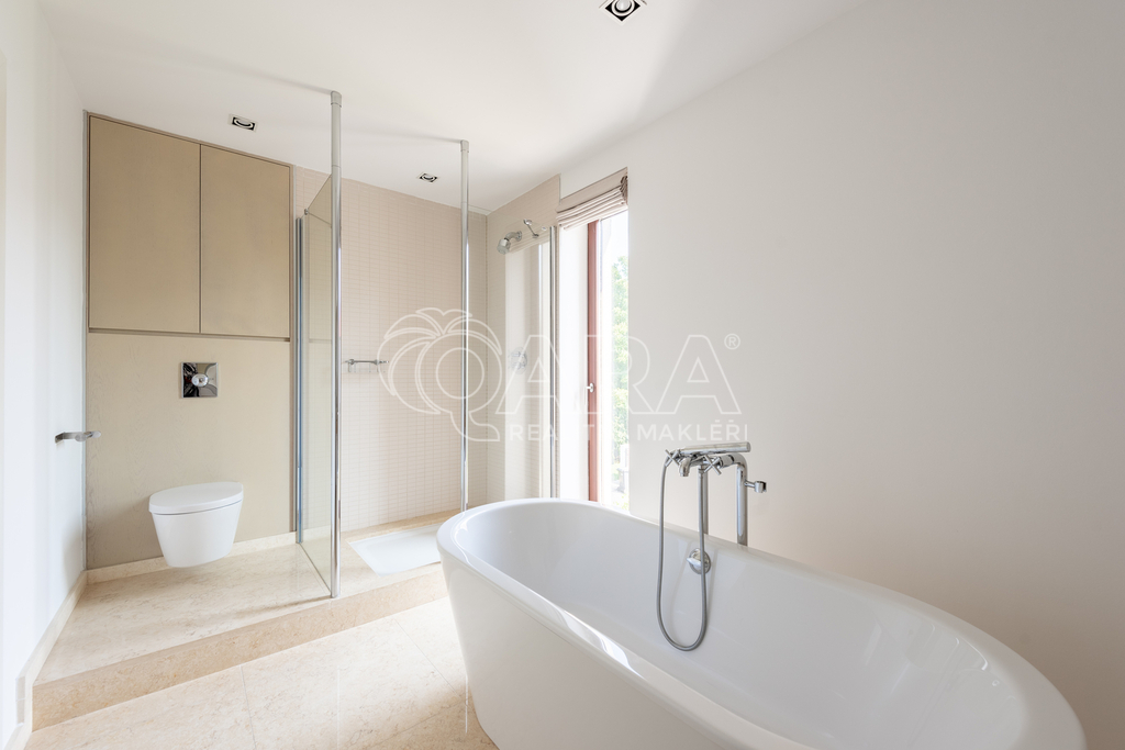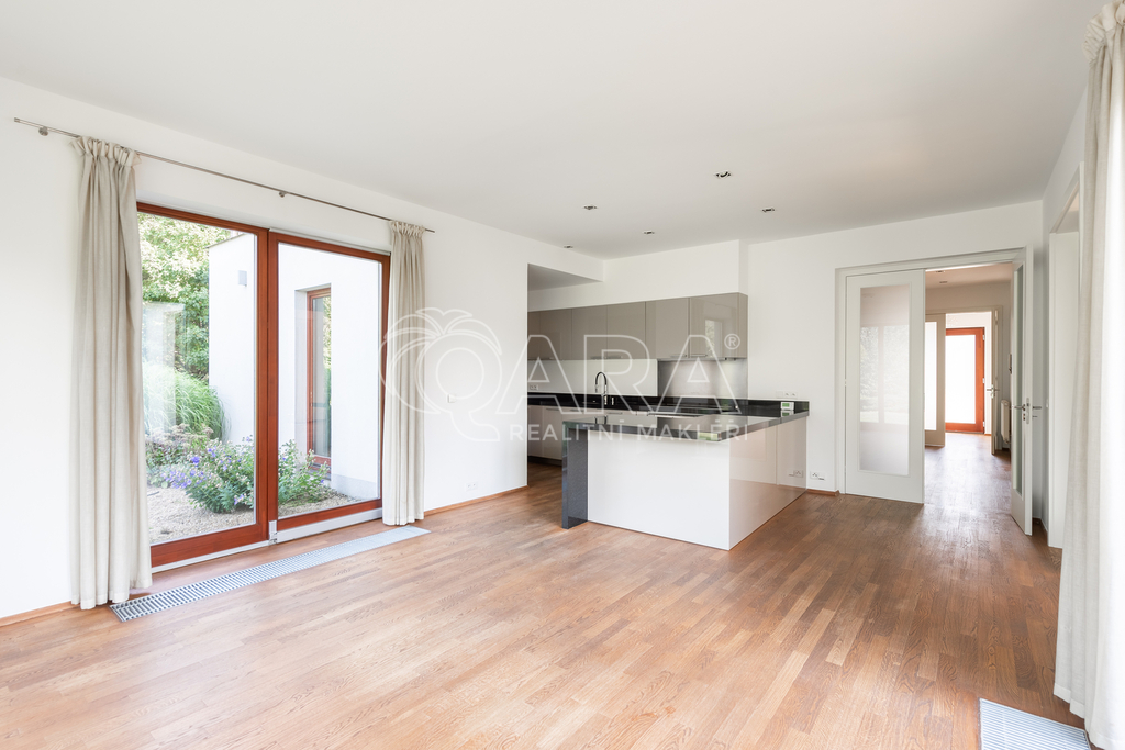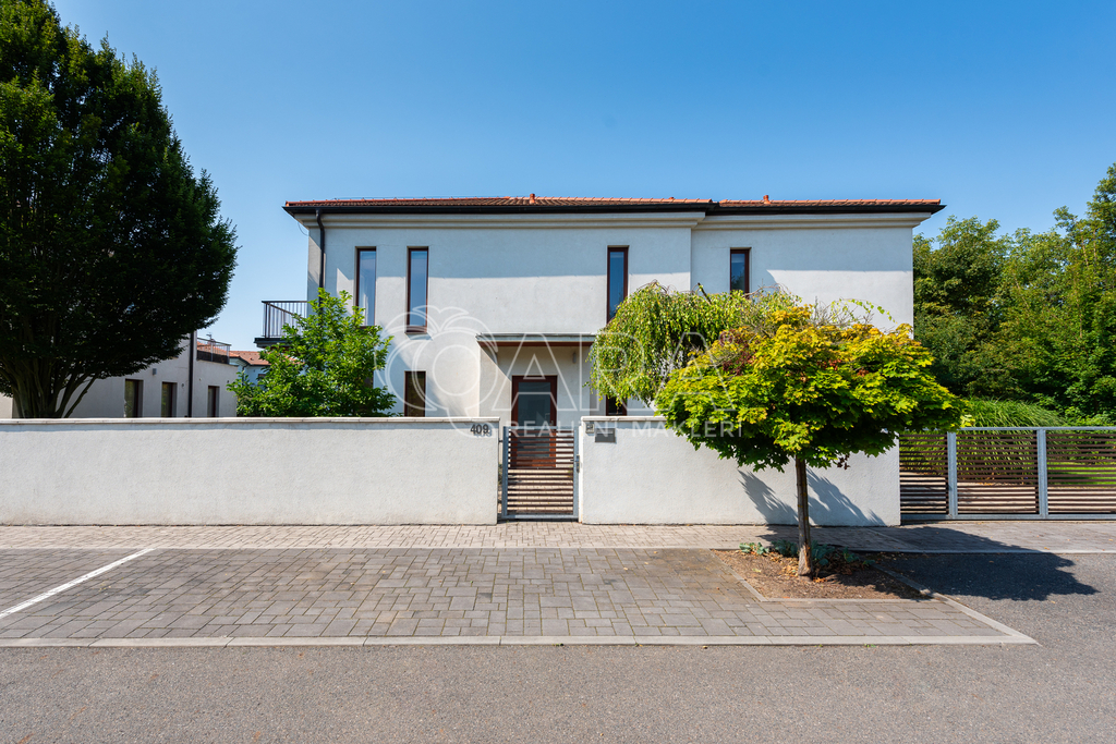 Dvoupodlažní dům s rozlohou 285 m2, který je charakteristický čistými liniemi a velkými francouzskými okny, nabízí v přízemí velkorysý obývací pokoj, prostornou jídelnu a kompletně zařízenou kuchyň s vestavěnými spotřebiči se vstupy na zahradu. V 1. patře se nachází hlavní ložnice s koupelnou a šatnou, dva dětské pokoje, jeden z nich s koupelnou, pokoj pro hosty a velká koupelna se sprchou a samostatně stojící vanou od designéra Philippa Starcka. Všechny ložnice umožňují přístup na balkón nebo terasu. Pro uložení sezónních věcí lze využít půdní prostor. V domě je kvalitní dřevěná dubová podlaha, mramorové obklady a vestavěné skříně. Součástí domu je rovněž garáž pro dva automobily, technická místnost s kuchyní a prostorem pro pračku a sušičku. Ohřev vody a vytápění jsou řešeny plynovým kotlem. Bezpečí zajišťuje kamerový systém v areálu celého projektu. Zahrada je zavlažována, pro posezení jsou u domu terasy.