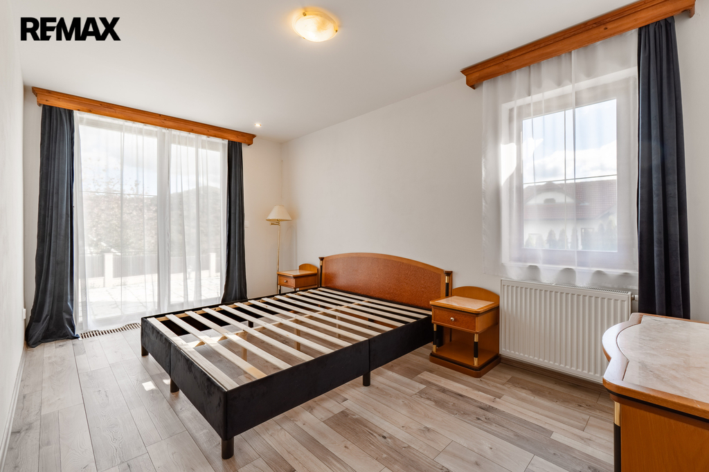 V přízemí domu se nachází prostorný obývací pokoj, kuchyň s jídelnou a dvě ložnice s koupelnou a toaletou, všechny tyto prostory mají přímý vstup na rozlehlou terasu. V patře jsou dvě prostorné ložnice, každá s vlastní koupelnou a toaletou a vlastním vstupem na balkon, respektive terasu. Prostory k uskladnění nabízí půda. Technická místnost, prostorná komora a šatna jsou k dispozici ve vstupní části přízemí, rovněž dvě krytá parkovací stání.