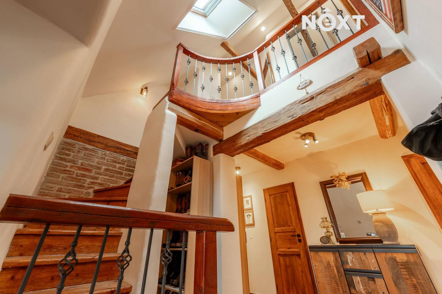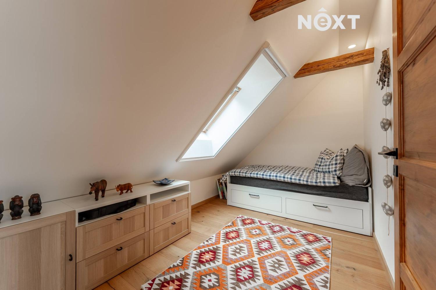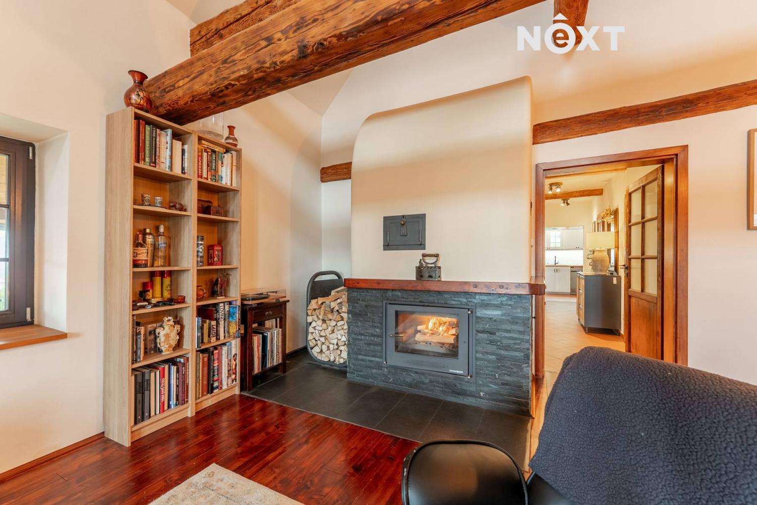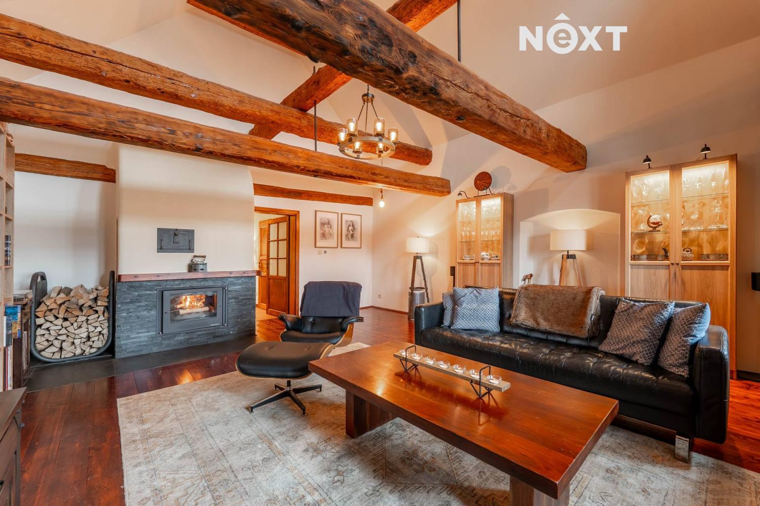• Přízemí: Srdcem domu je prostorný obývací pokoj s krbem a masivní dřevěnou podlahou. Kuchyně (sporák, myčka, lednice, praktická spíž), moderní koupelnu s vanou i sprchovým koutem, samostatnou toaletu, místnost pro pračku.