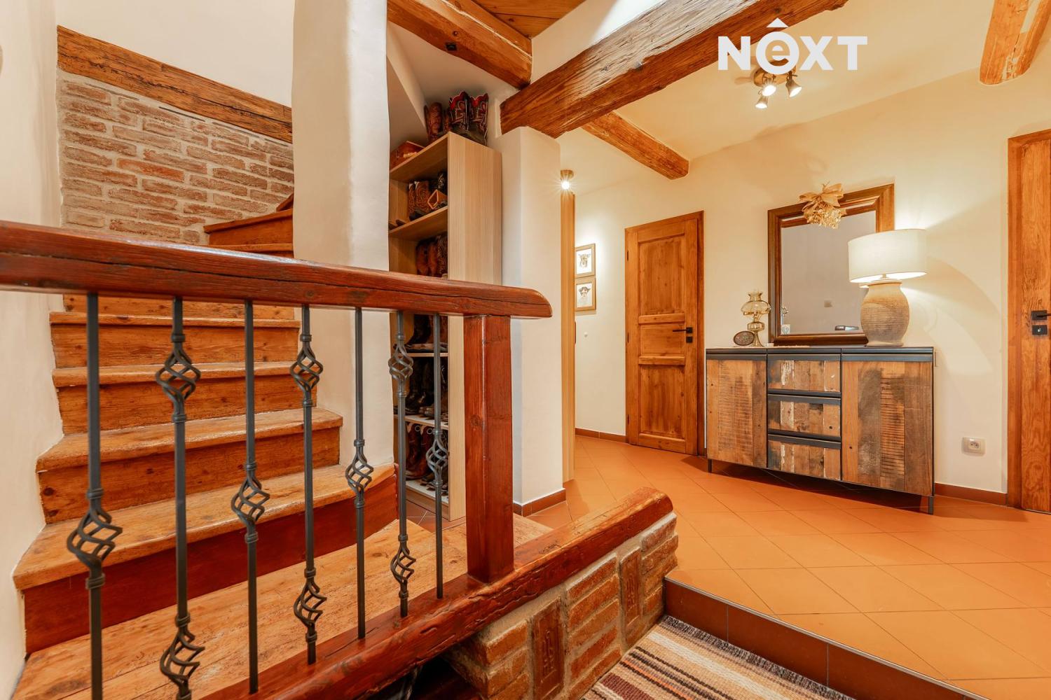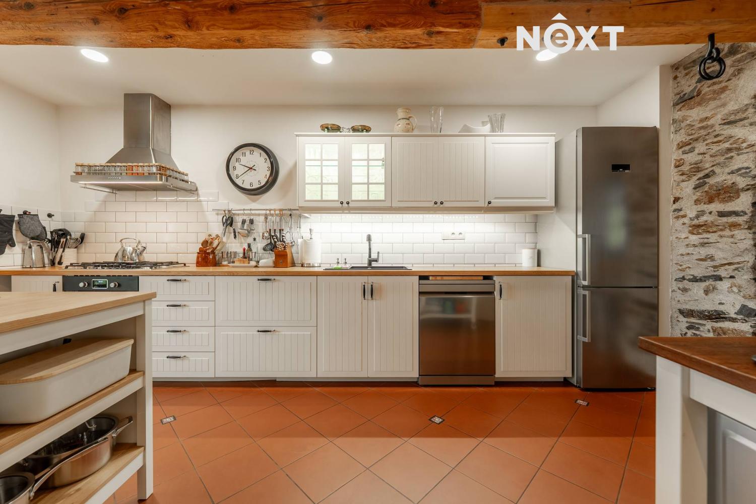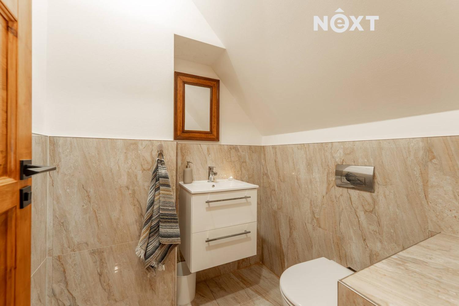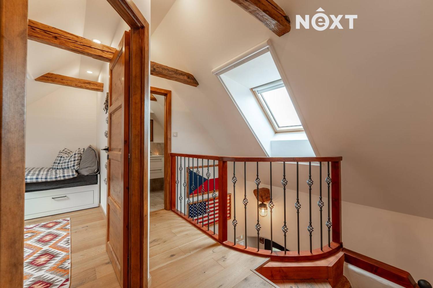 • Přízemí: Srdcem domu je prostorný obývací pokoj s krbem a masivní dřevěnou podlahou. Kuchyně (sporák, myčka, lednice, praktická spíž), moderní koupelnu s vanou i sprchovým koutem, samostatnou toaletu, místnost pro pračku.