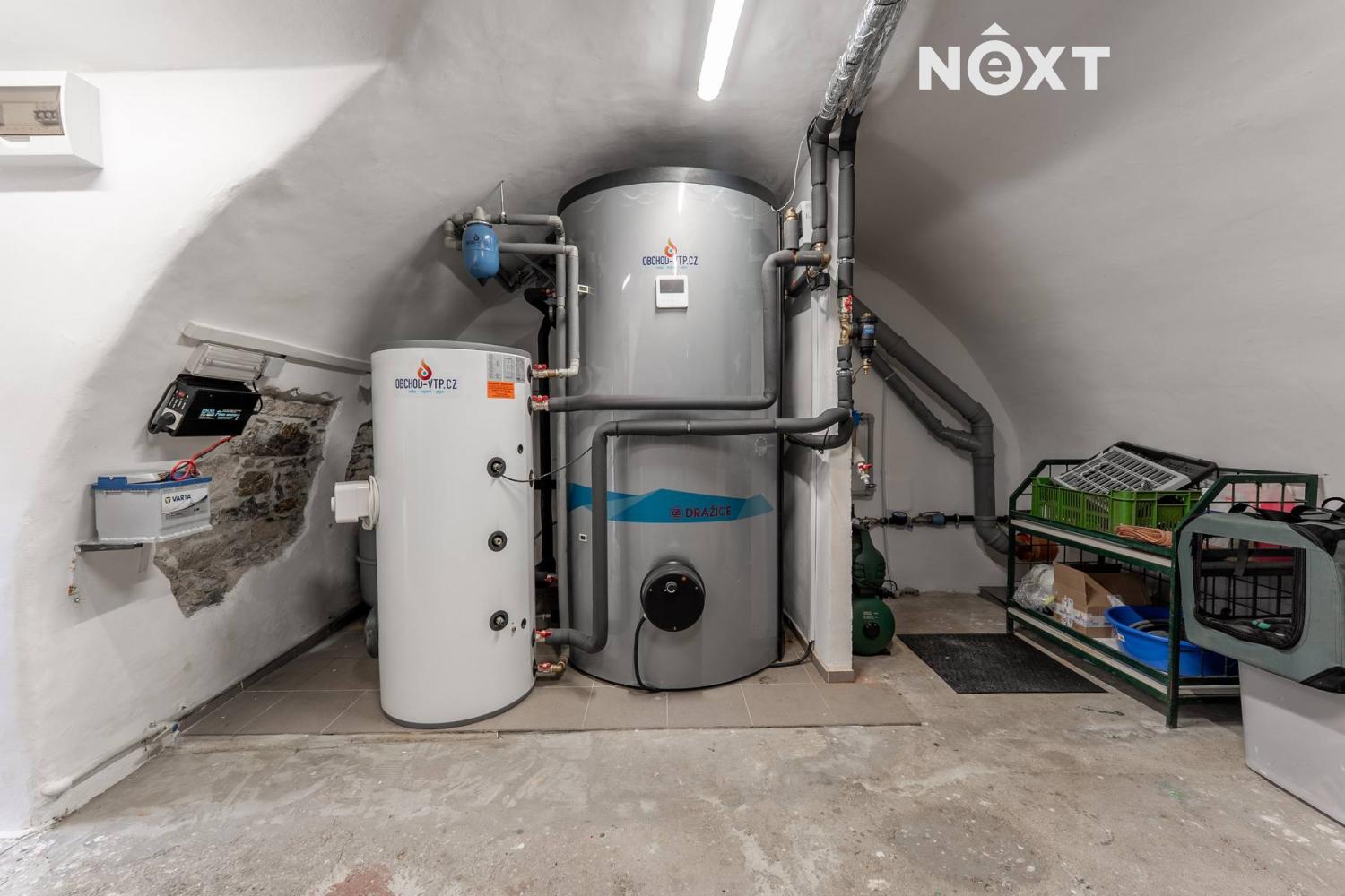 • Promyšlené a úsporné vytápění: O tepelný komfort se stará teplovodní podlahové topení rozvedené po celém domě. Srdcem systému je velká akumulační nádrž české značky Dražice (1 000 l) .Tuto nádrž můžete ohřívat třemi způsoby: tepelným čerpadlem vzduch-voda LG Therma V (9 kW), elektrokotlem nebo výkonným krbem s teplovodním výměníkem (Haas+Sohn, 20 kW). Krb navíc rovnou napřímo a bleskově vyhřívá i obývací pokoj. Ohřev užitkové vody zajišťuje samostatný bojler Dražice o objemu 208 litrů, napojený na tepelné čerpadlo.