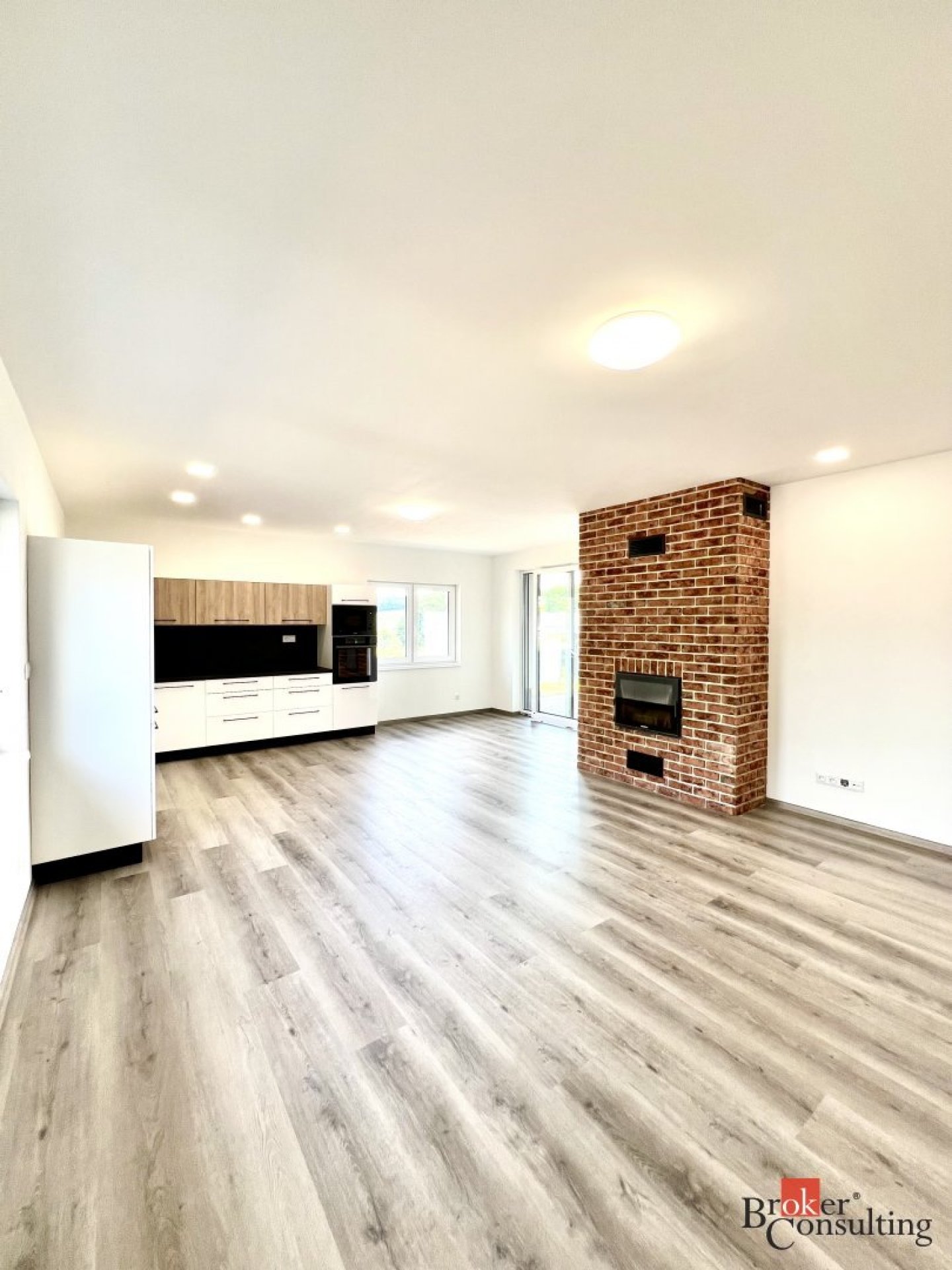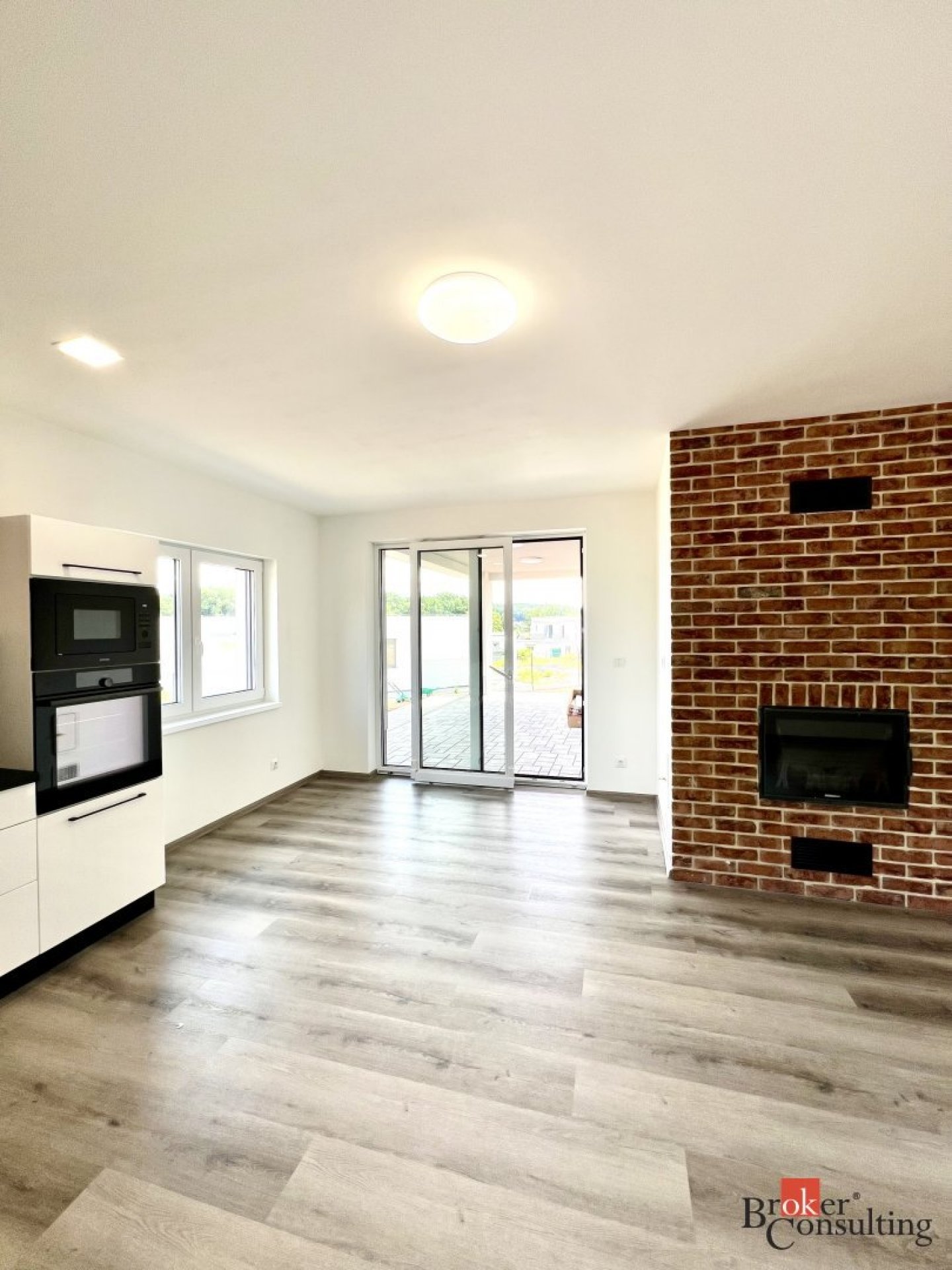 Dominantu a srdce celého domu je prostorný obývací pokoj se výstupem na terasu a menší zahradu. Obývací pokoj s krbem, propojen s rohovou kuchyňskou linkou a jídelním koutem.