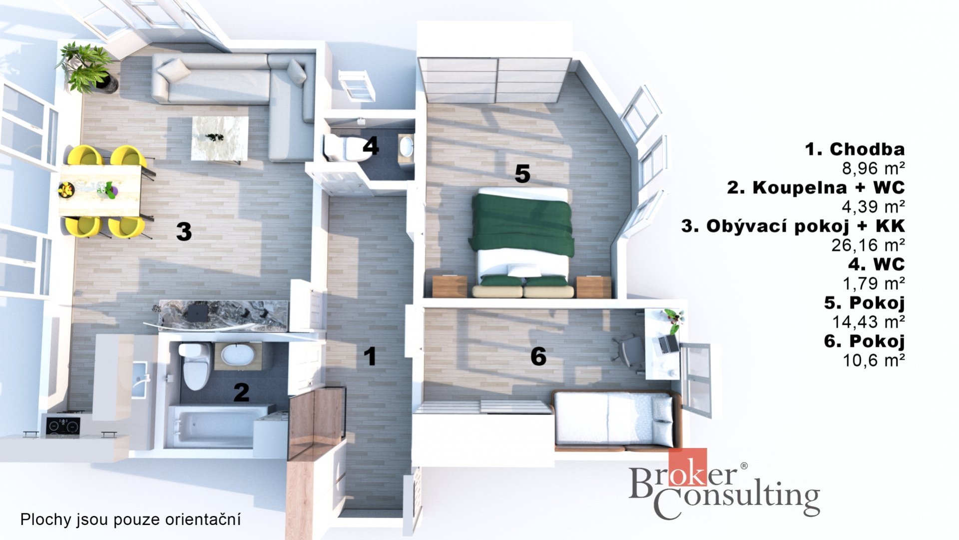 Uvedené výměry jsou orientační. Veškeré zveřejněné údaje mají pouze informativní charakter a nepředstavují nabídku ve smyslu § 1731 nebo § 1732 občanského zákoníku, ani veřejný příslib dle § 1733 občanského zákoníku.