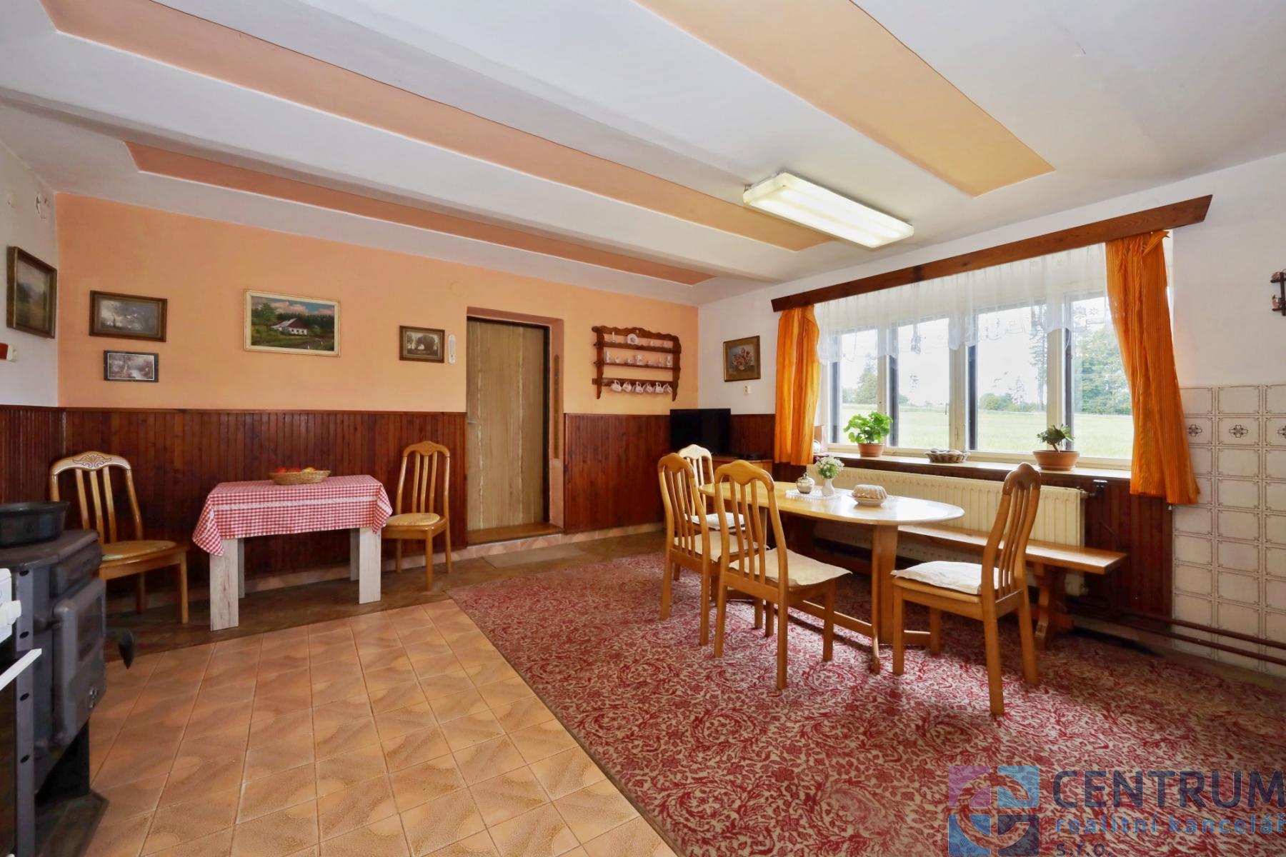 V přízemí domu se nachází prostorný obývací pokoj s krbem, který navozuje útulnou atmosféru a přímo vybízí k rodinným setkáním. Dále zde najdete velkou kuchyň, ložnici, koupelnu s WC, komoru a kotelnu. Celé přízemí je vytápěno kotlem na tuhá paliva s rozvodem do radiátorů, což zajišťuje příjemné teplo i v chladných měsících. Zdrojem vody je studna.