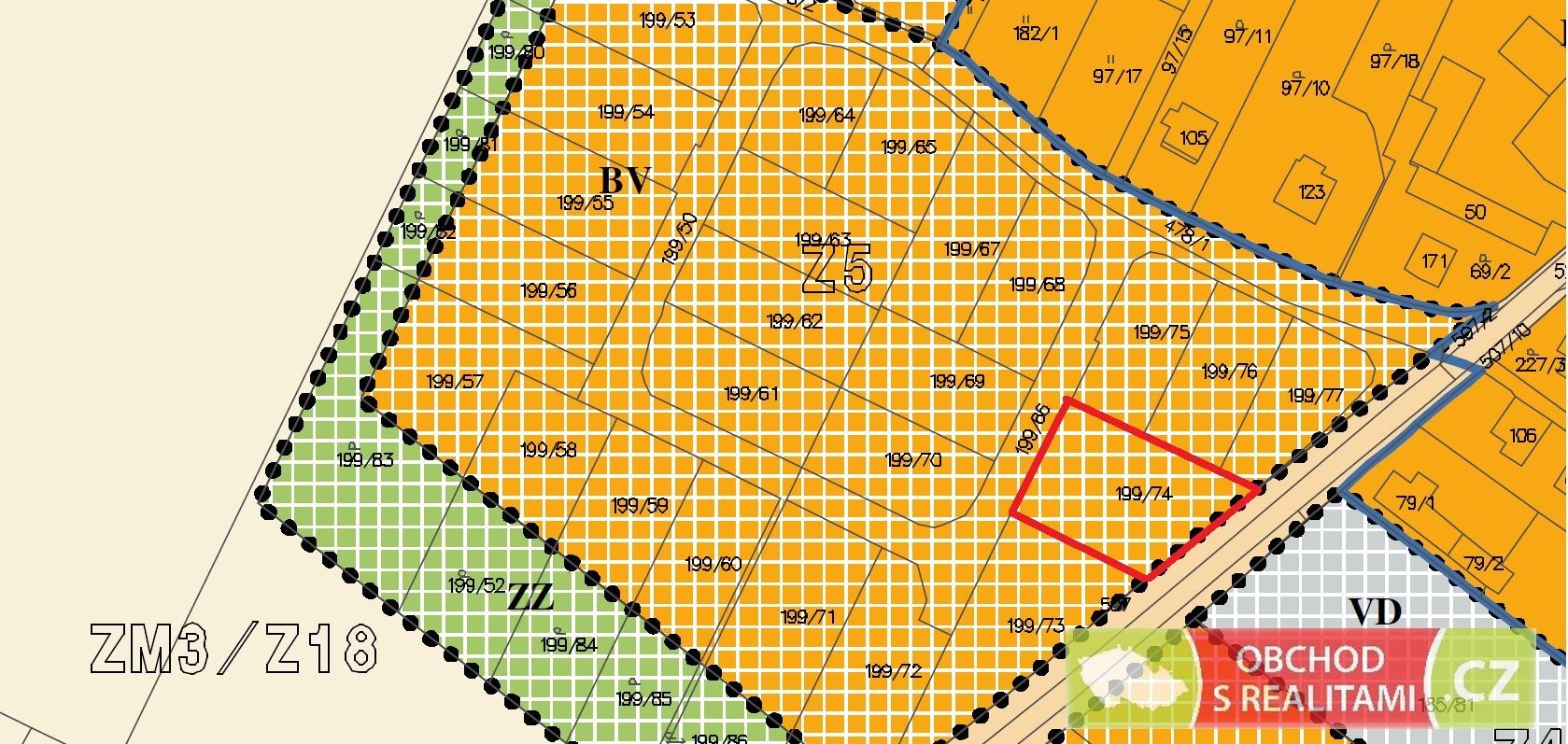 V této inzerci nabízíme pozemek parc. č. 199/74 o výměře 1.263 m2. Pozemek se nachází v jednosměrné ulici s omezeným provozem aut (jen sousedi). Pokud se pojedete na místo podívat, pozemek je na místě označen číslem 4.