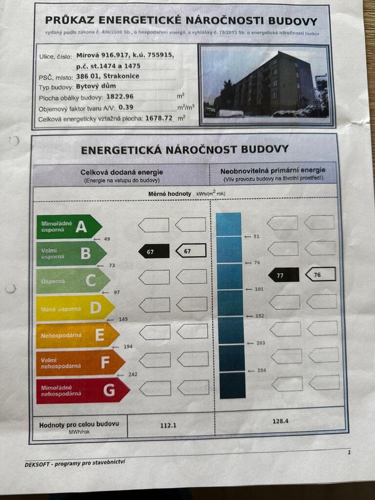 - Ukazatel energetické náročnosti budovy: 67 kWh/m²