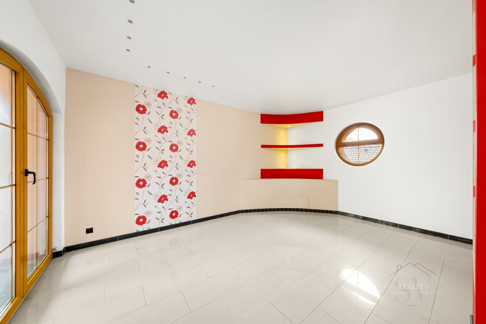 Dispozice domu je velmi praktická. V přízemí se nachází prostorný obývací pokoj se vstupem na zahradu i do wellness, kuchyňský kout, pokoj vhodný jako pracovna nebo pokoj pro hosty, koupelna a technické zázemí. V patře je hlavní ložnice se dvěma šatnami, tři další pokoje a koupelna.