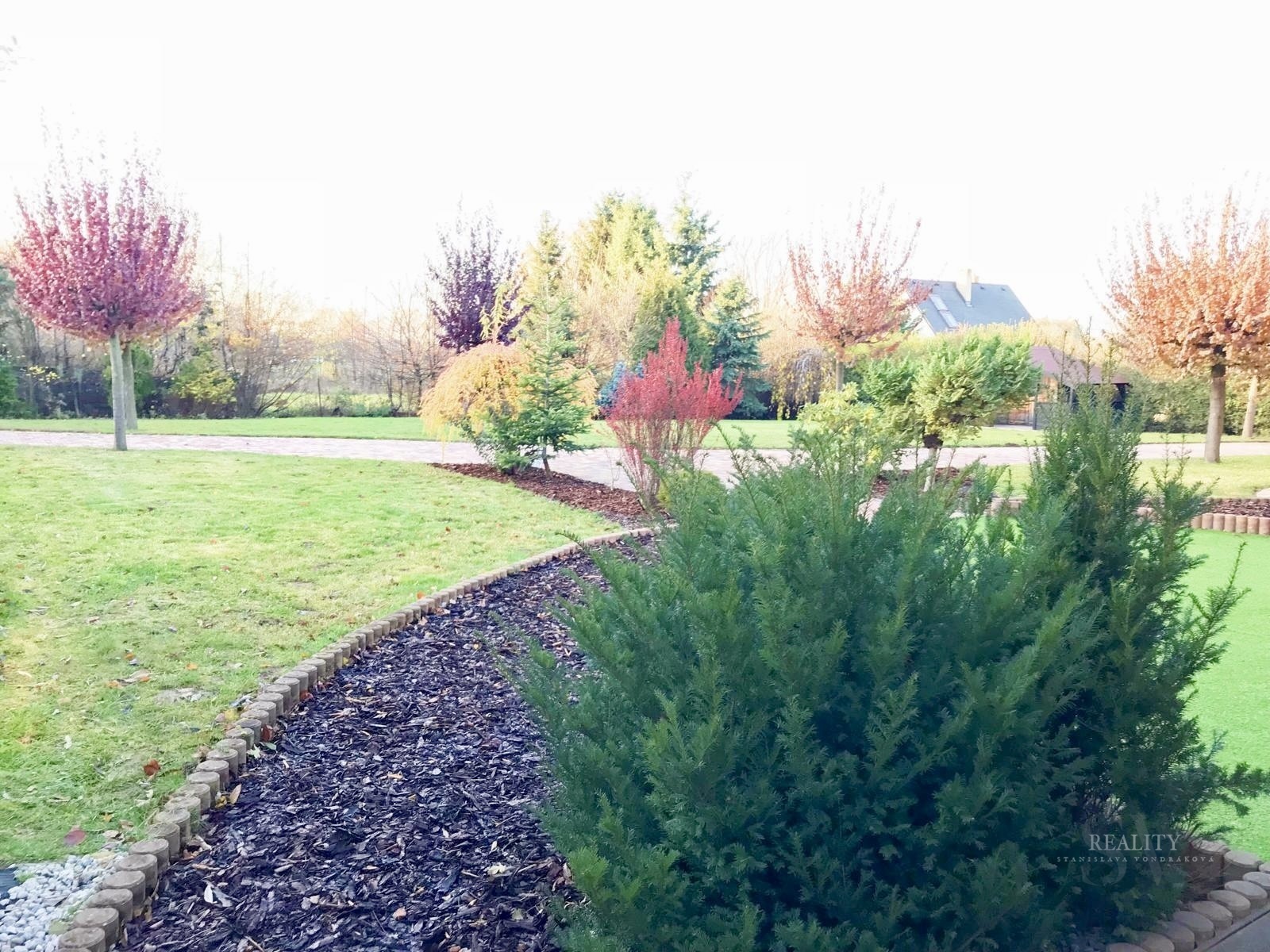 Pozemek je kompletně oplocený a nabízí absolutní soukromí. Zahrada je členitá, osázená vzrostlými stromy a okrasnými dřevinami, s několika klidovými zákoutími. Součástí je altán s velkým zděným grilem a posezením. Pohodlí zajišťuje elektrická vjezdová brána, krytá garáž a dlážděné přístupové cesty. Architektura domu klade důraz na propojení interiéru s exteriérem prostřednictvím francouzských oken a obloukových prvků.