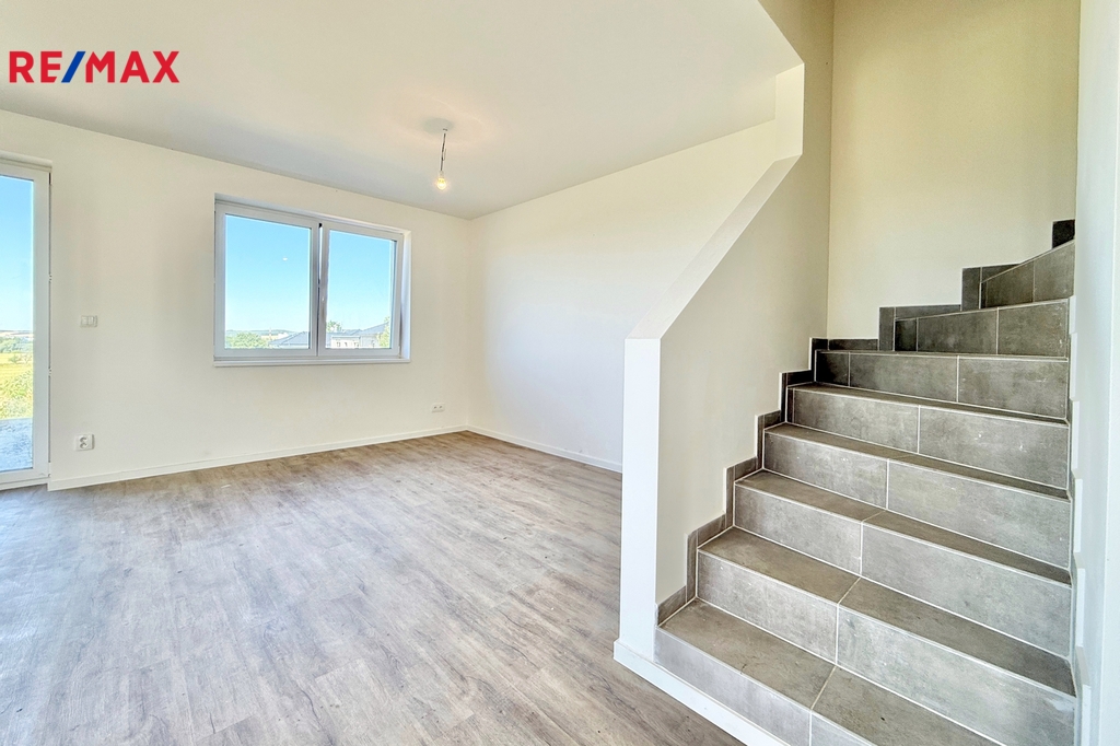 Přízemí: prostorný obývací pokoj s přípravou na kuchyňskou linku, přímý vstup na terasu a do zahrady, samostatná toaleta, technická místnost.