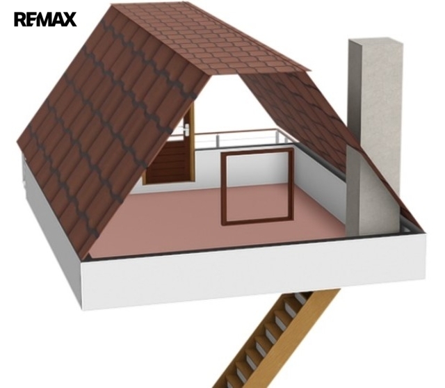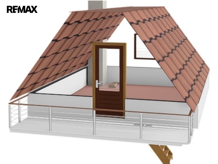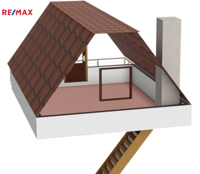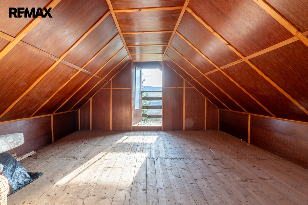 Z obytné místnosti vedou dále dřevěné schody s poklopem v podlaze nahoru do podkroví, kde najdete totožnou podlahovou plochu jako u spodní části omezenou výškou střechy a jejími šikminami. Tento prostor je ideální na spaní. Patří k němu také výstup na balkon orientovaný stejným směrem jako ten spodní.