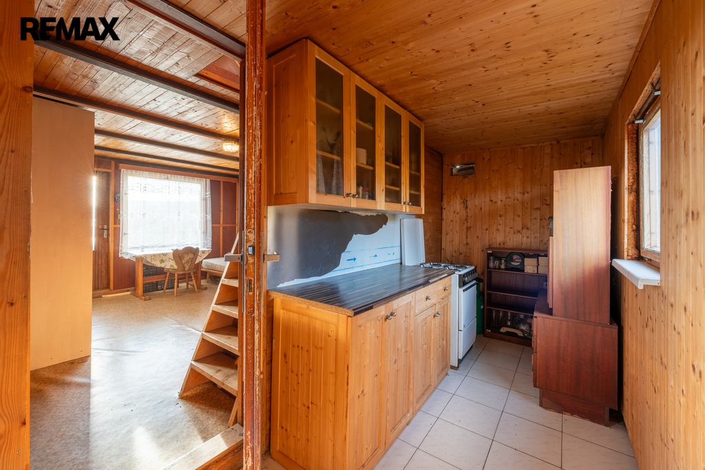 Do obytné části, která začíná v přístavbě se vchází z venkovní terasy. Je zde vstupní prostor pro odložení věcí a také kuchyňka s menší linkou a sporákem na plynovou lahev. Na podlaze je položena dlažba.