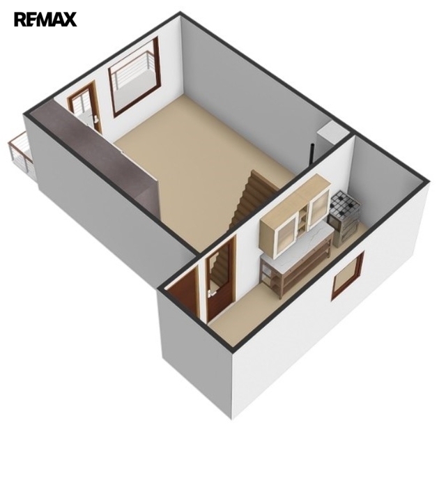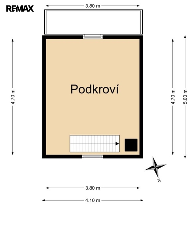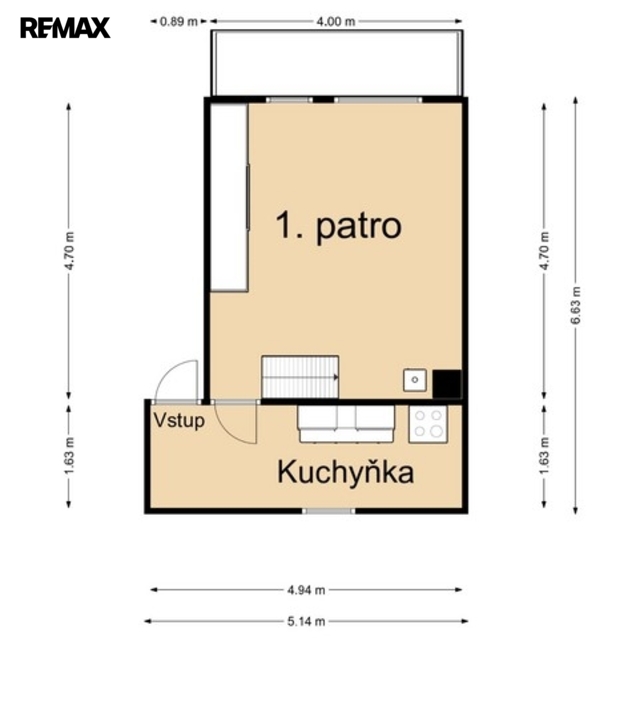 ✔1. patro - 4,7 x 3,77m (výška stropu 2,3m) + kuchyňka 4,93 x 1,63m