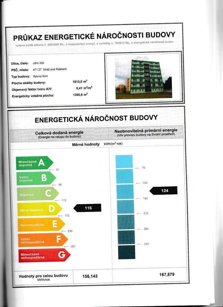 - Ukazatel energetické náročnosti budovy: 116 kWh/m²