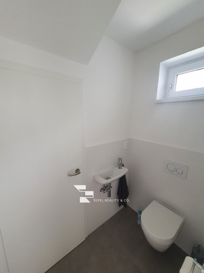 V přízemí je samostatná toaleta s umyvadlem. Z obývacího pokoje je vstup na venkovní dlážděnou terasu 20m² s markýzou a zahradu cca 300m².