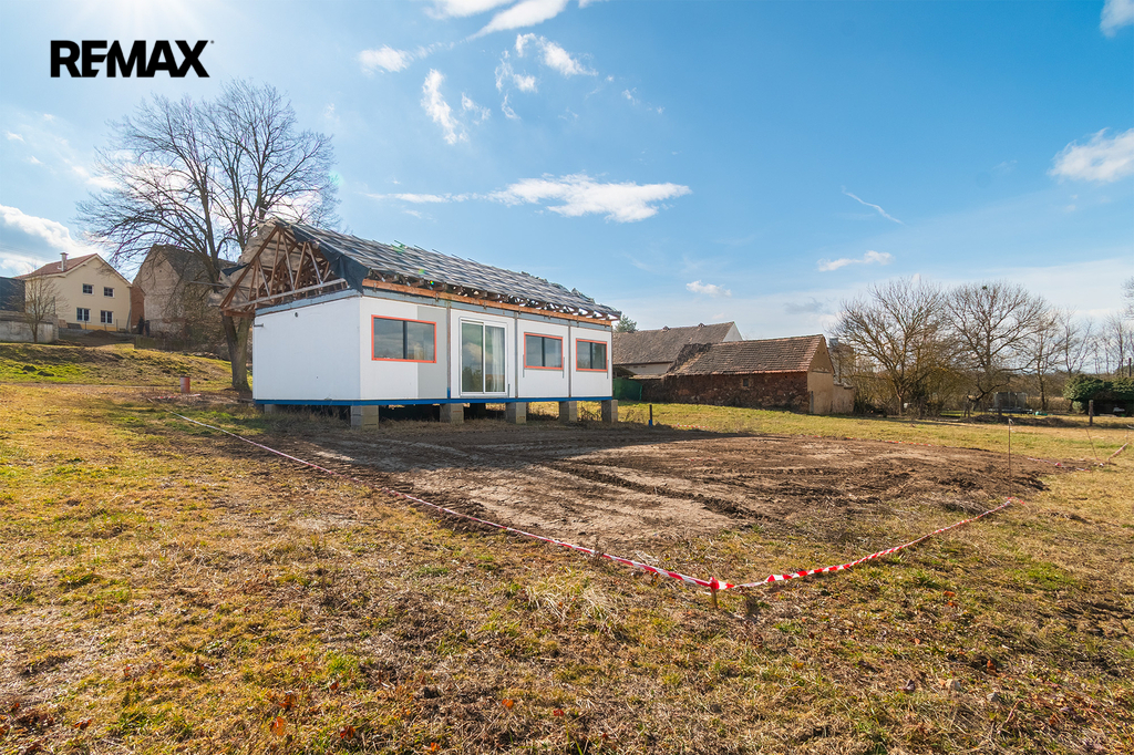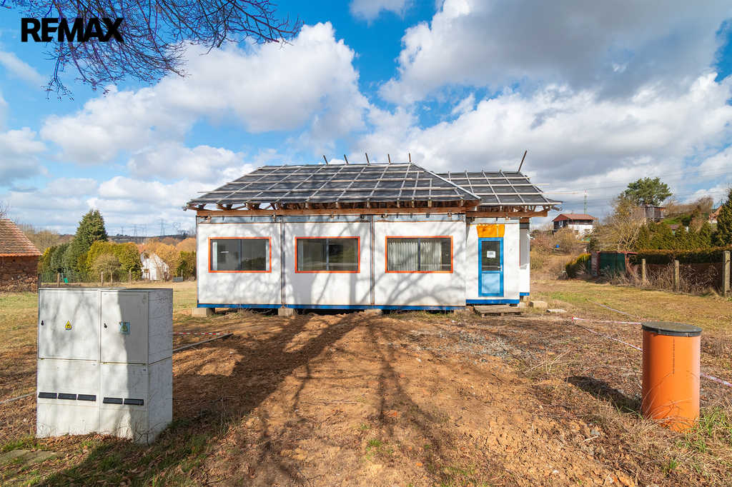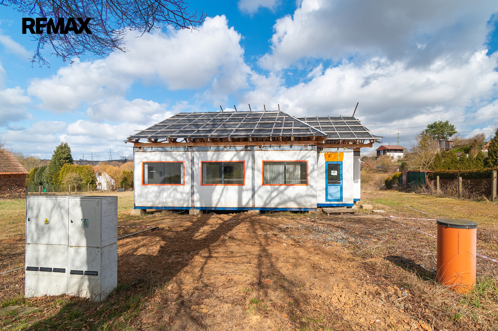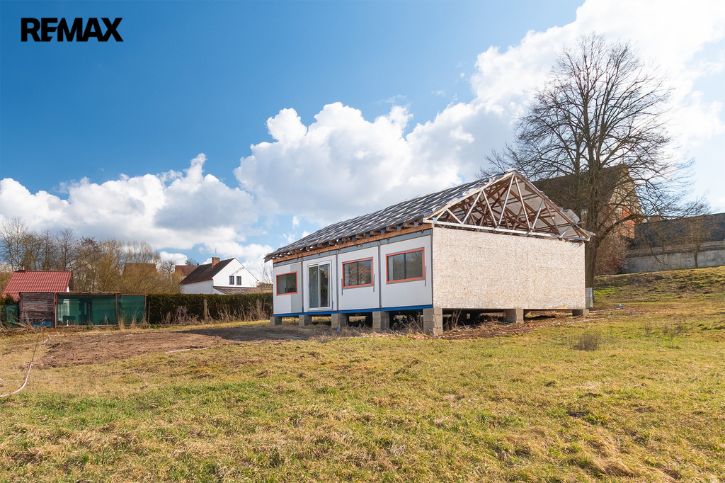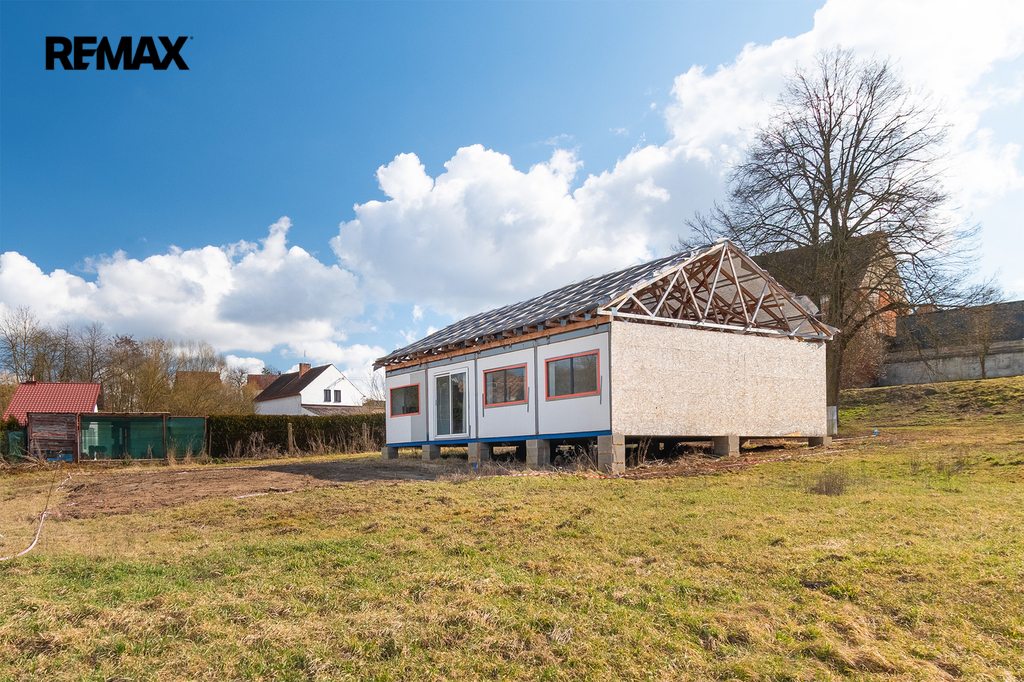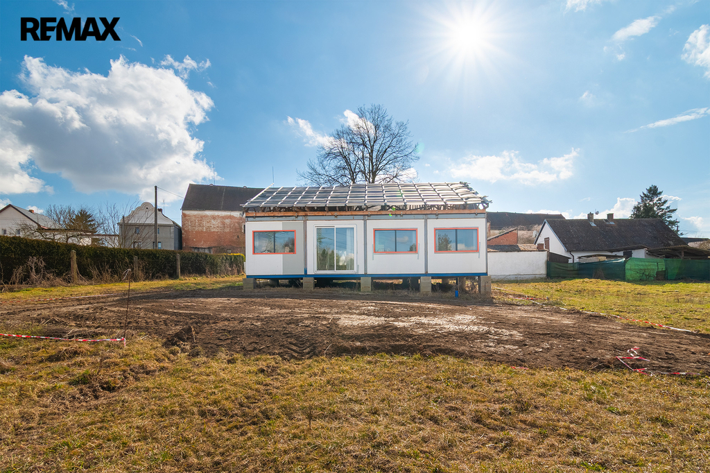 Modulový přízemní rodinný dům 4+kk s orientační užitnou plochou 100 m² je navržen jako samostatně stojící přízemní objekt s modulovou konstrukcí, postavený na betonových patkách. Dispozice zahrnuje obývací pokoj s kuchyňským koutem, ložnici, dva pokoje, koupelnu a závětří. Světlá výška místností je ca. 2,5 metru. Střecha je sedlová s výškou hřebene ca. 5,5 metru a je připravena k dokončení. Fasáda je řešena z pohledových modulových panelů s PIR zateplením o tloušťce 160 mm. Okna a dveře jsou řešeny posuvným systémem a francouzskými dveřmi vedoucími do zahrady. Základy tvoří železobetonové patky o rozměrech 500 × 500 × 800 mm s ocelovým nosným rámem HEB 200 mm. Samonosná ocelová konstrukce domu se sendvičovým zateplením je doplněna vnitřními SDK obklady a příčkami o tloušťce 100 mm. Strop je modulový a střešní konstrukci tvoří dřevěné sbíjené vazníky. Vytápění je zajištěno plynovým kondenzačním kotlem INTERGAS Kombi Kompakt HRE 36/30 A s radiátory. Stavební úřad potvrdil podmínky pro vydání společného souhlasu, ohlášení stavby.